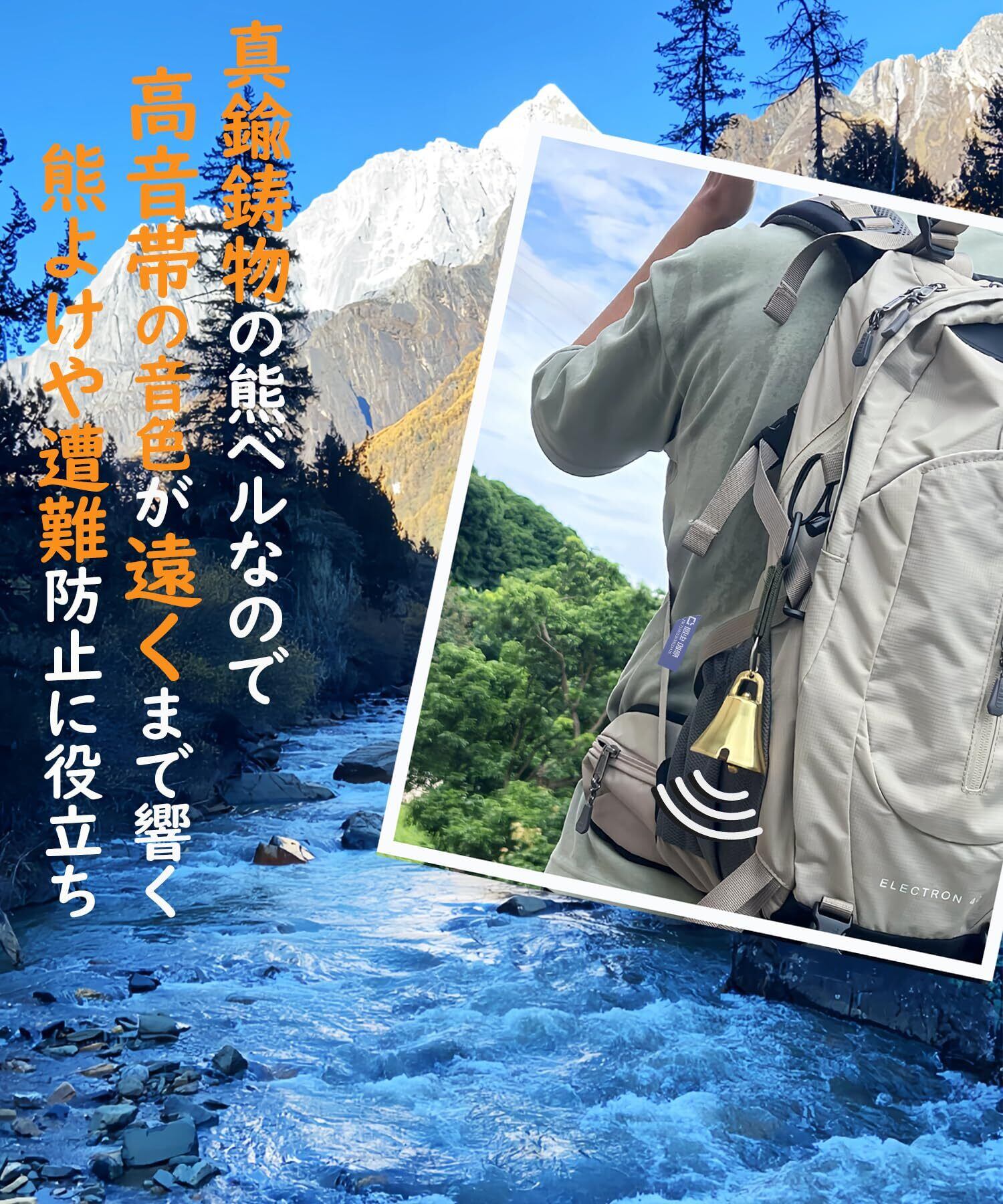 【簡単なお手入れ】耐水性と耐久性に優れた真鍮製とアルミ製カラビナ、汚れや雨にも強く、過酷な環境下での長期使用に対応します。少しの衝撃では変形しません。障害物の多い山の中でも問題なく鈴の音を鳴り響かせます。ハイキング、トレッキング、渓流釣り、キャンプ、登山はもちろん、通学や散歩など、多彩なアウトドアシーンや日常生活でも活躍してます。