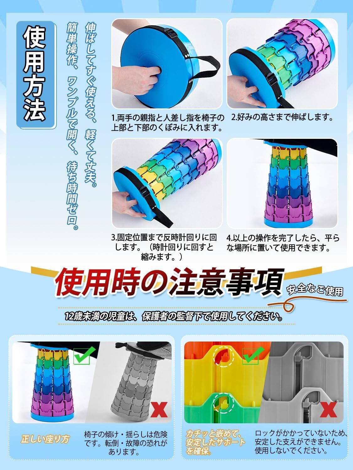 【注】(1) 平坦で堅固、傾斜のない地面で使用してください。柔らかく凹凸のある地面や滑りやすい地面では、折りたたみ椅子の荷重が偏り、局部的な過負荷により破損する恐れがあります。(2) 使用時は必ず全ての留め具が確実にロックされていることを確認してください!留め具が半噛み状態や遊びがある状態は排除する必要があります。(3) 着座時は椅子の中心を正面に向け、体重をゆっくりとかけ、急な着座・横倒れ・後傾などの異常姿勢を避けてください。急激な衝撃負荷や重心移動は、設計基準を大幅に超えるトルクや曲げモーメントを瞬時に発生させます。(4) 使用前には、ユーザーが椅子の各部品に損傷(ひび割れ・変形など)がないかを確認し、全てのロック機構が正常に機能し緩みがないことを確認する責任があります。(5)12歳未満の児童は、保護者の監督下で使用してください。