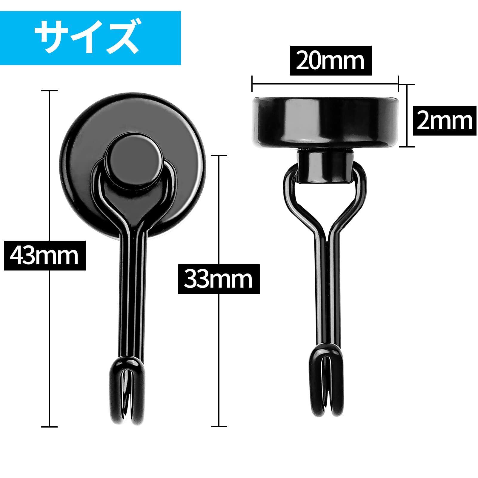 【6個セット】マグネット フック 磁石 フック 超強力 磁石付き ステンレス製 防錆 垂直耐荷重15kg キッチン用 オフィス用 冷蔵庫 玄関キー ホルダー 浴室 お風呂 壁掛け用 (6, ブラック) 43*20*12mm