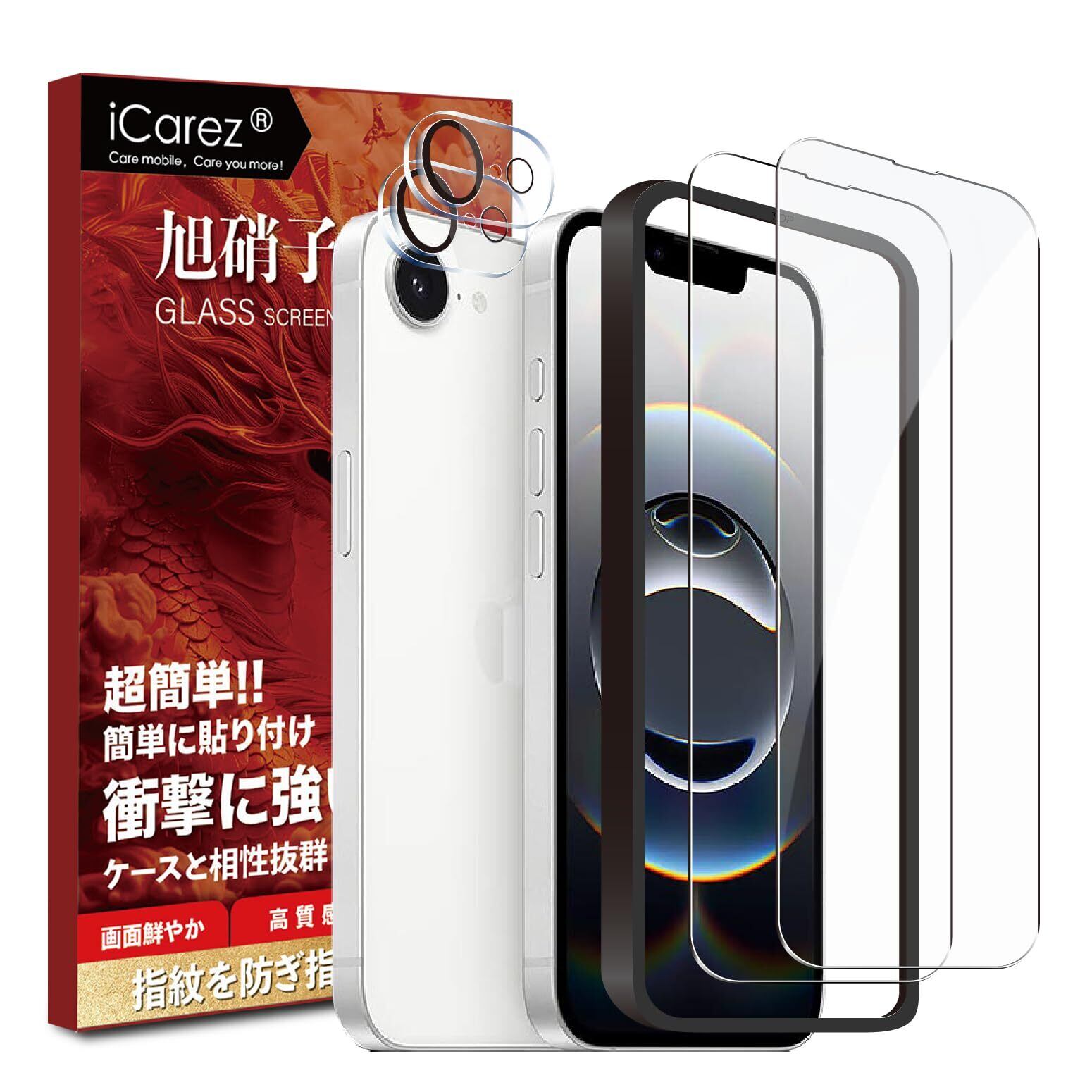 iCarez 対応 iPhone 16e ガラスフィルム 【フィルム 2枚 + カメラフィルム 2枚 +ガイド枠付き】旭硝子素材製 いPhone 16e 保護フィルム iPhone 16e 2025年モデル スマホフィルム 携帯 フィルム アイフォン16e レンズ 画面保護 フィルム 硬度9H 指紋認証鋭敏 耐衝撃 自動吸着 気泡なし 指紋防止 ICGSE4I2J2