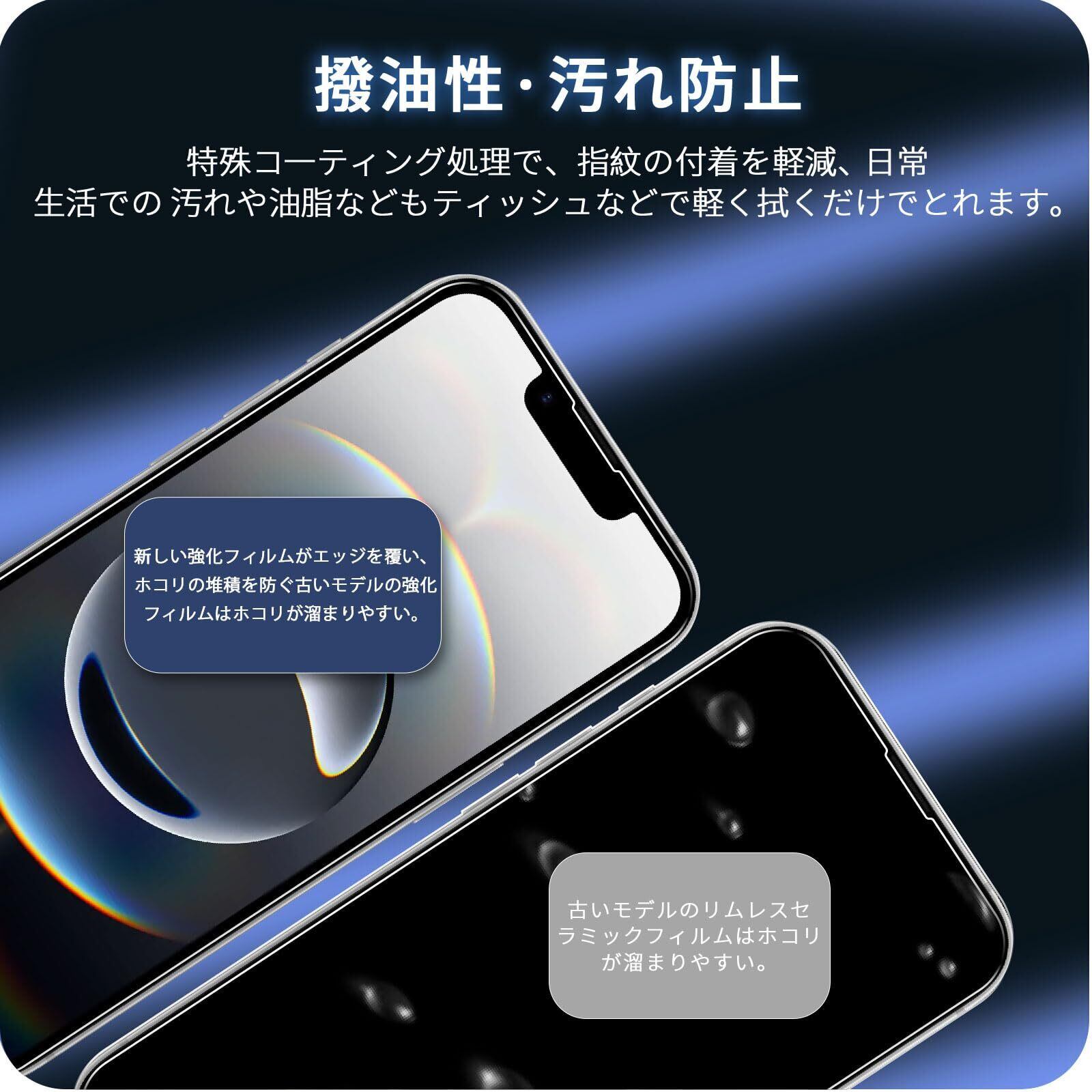 【指紋防止・汚れ防止】ガラスフィルムは特殊なコーティング加工を施しましたので油や指紋など付いても軽く拭けば汚れはすぐに落ちます。