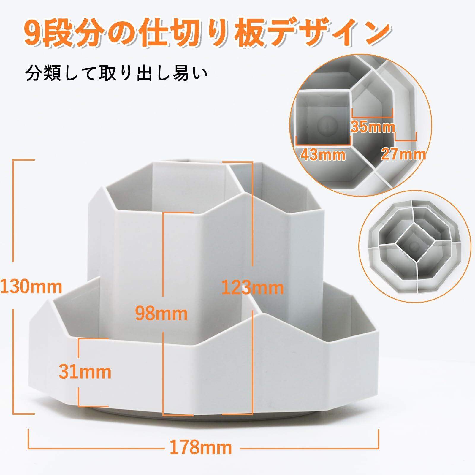 【360度回転】:底面には精密な鋼球が取り付けられており、360度回転することができます。静かで回転がスムーズです。使いやすいデザイン:9グリードの高さのバランスを取り、あらゆる角度から簡単にアクセスでき、もの探しには最高です。各グリードの表面にバリ処理され、物を取り出す際に手に傷をつくことがない優しいデザインです。