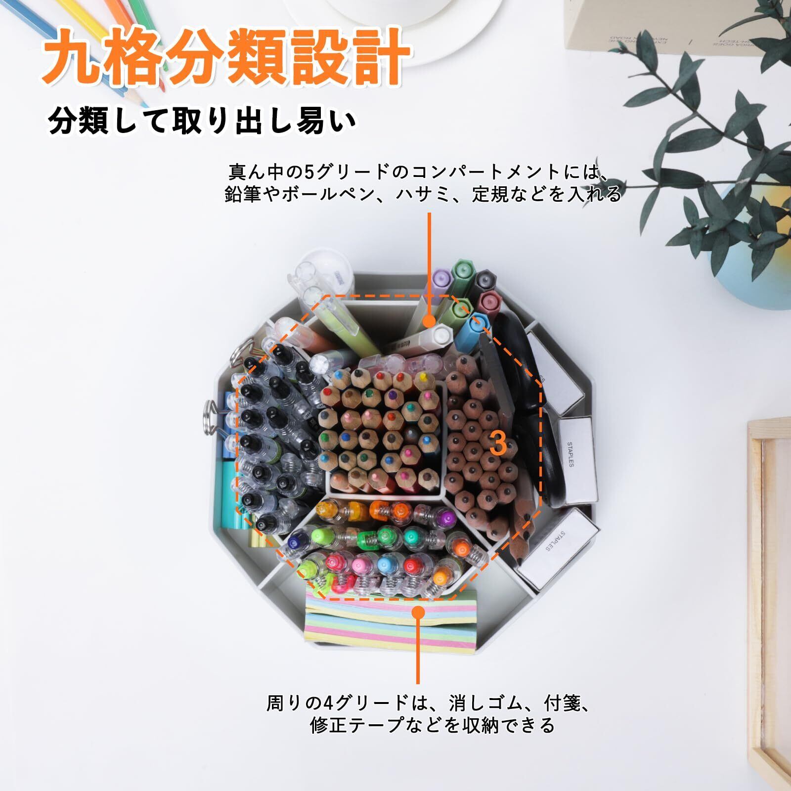 【実用性と機能性】:大容量な仕切りデザイン、9格の収納ボックスがあり、ペン、鉛筆、マーカー、定規、消しゴム、ペーパークリッパなどの文房具を簡単に分類して収納できます。テーブル上小物の整理整頓は効率的です。中央の5つの独立したコンパートメントに鉛筆を150本以上収納可能、周囲の4つ独立したコンパートメント、消しゴムやクリップ、追加の文房具などの整理に便利。デスクトップをすっきりとした状態に保ちます。