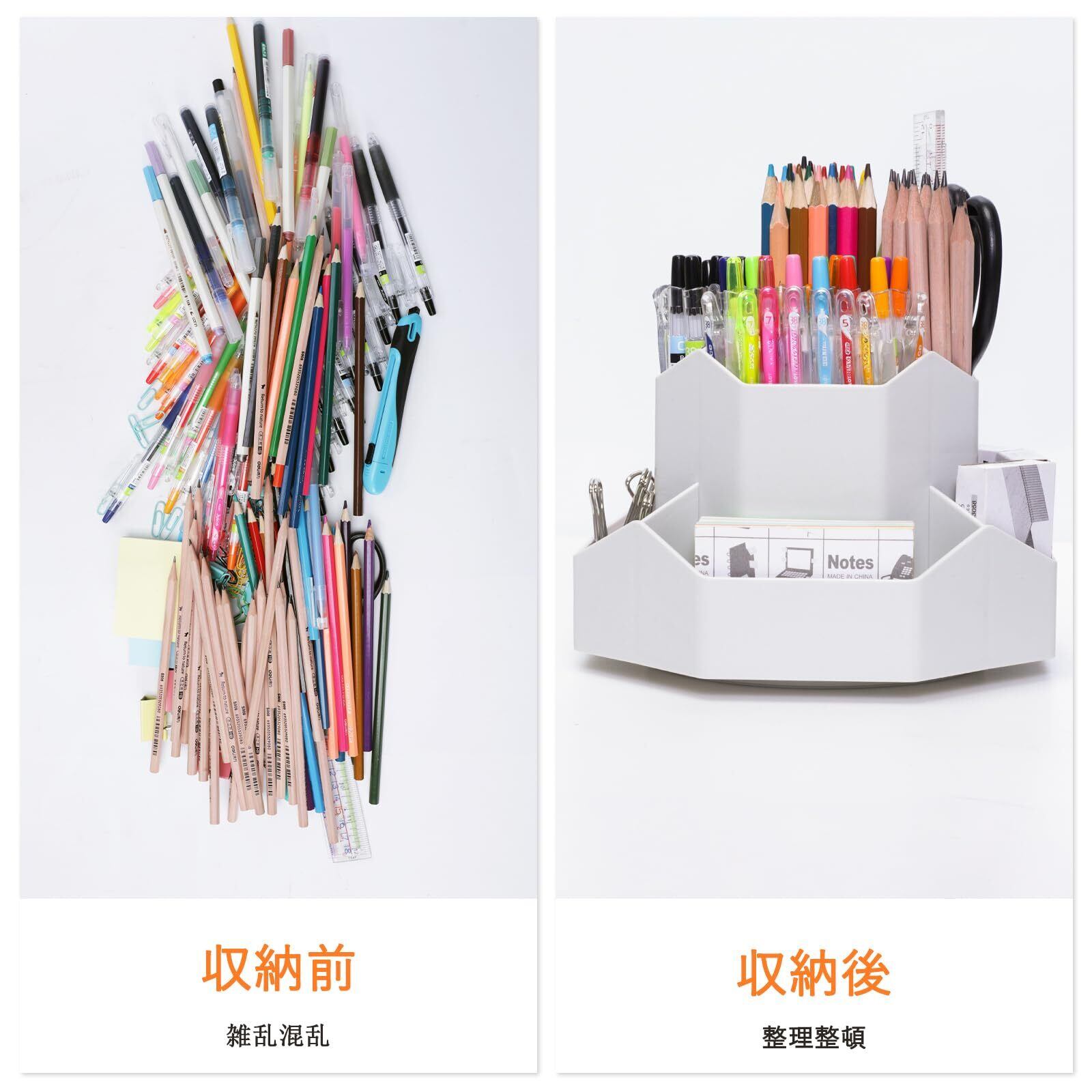 【あらゆる場面で活躍する卓上収納】:オフィス、家庭、学校、ホテル、書斎、寮、リビング、教室、寝室など様々なシーンにご利用でき、欠かせない収納グーズです。ペンやハサミなどの事務系学用品の収納、メイクブラシなどのメイク道具の収納にも最高です。