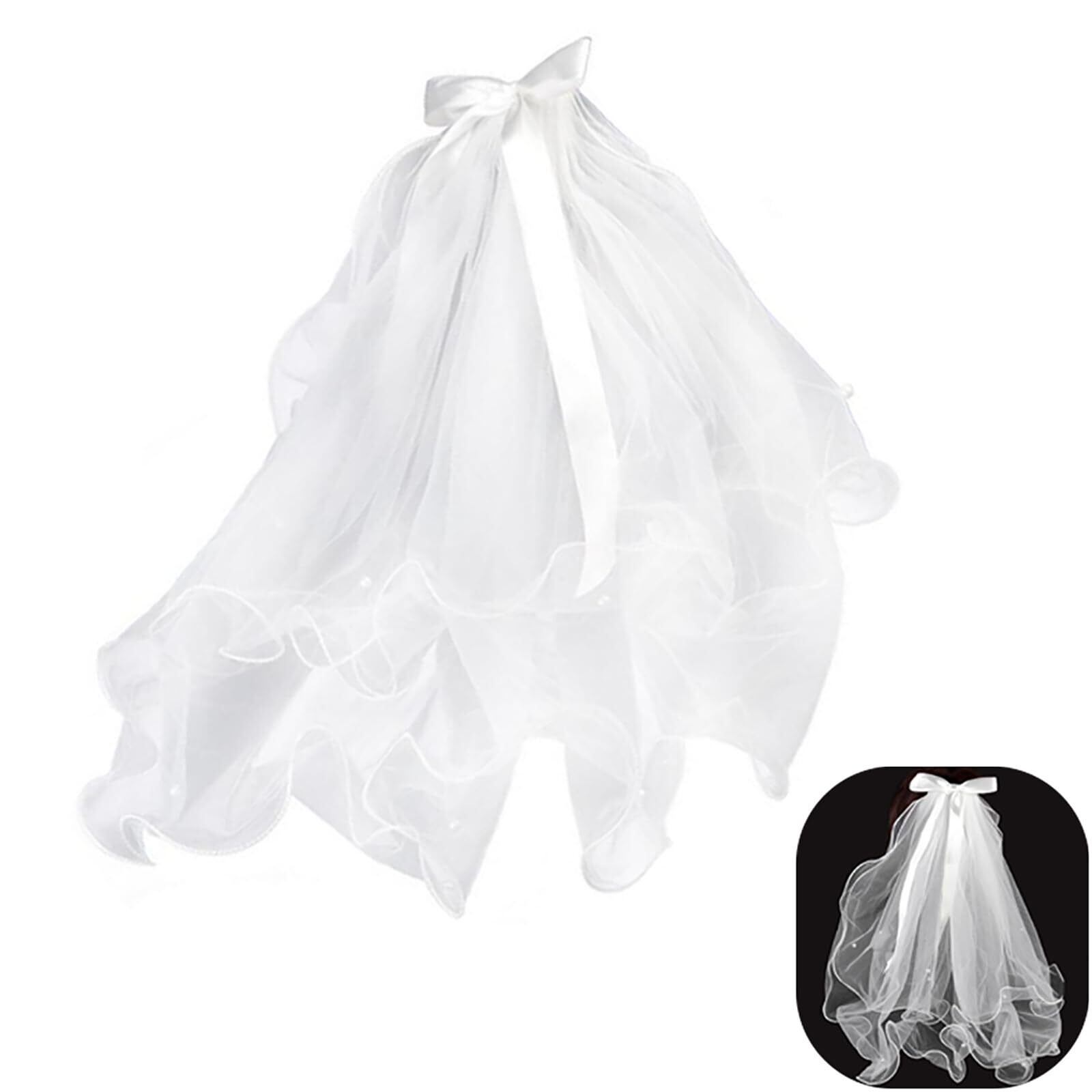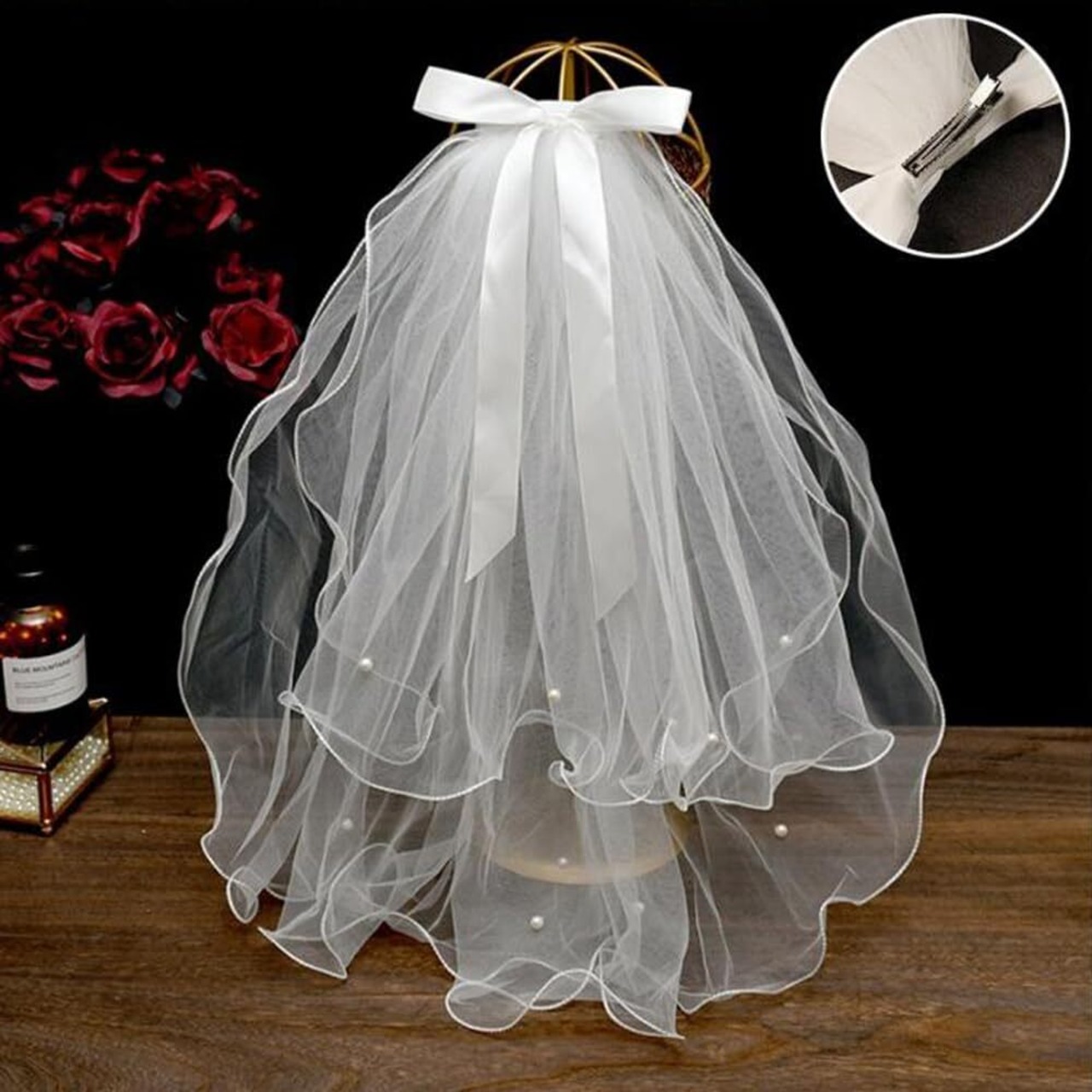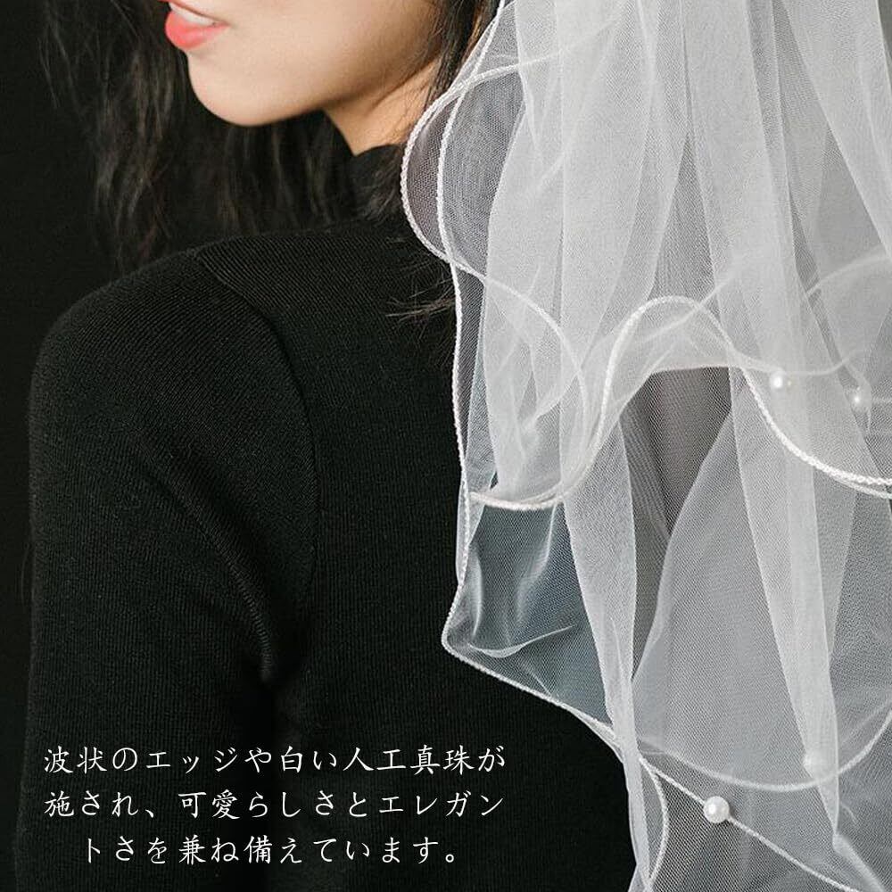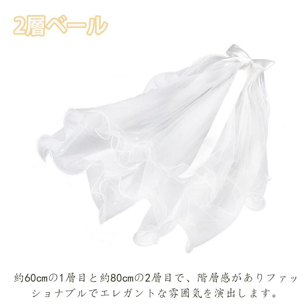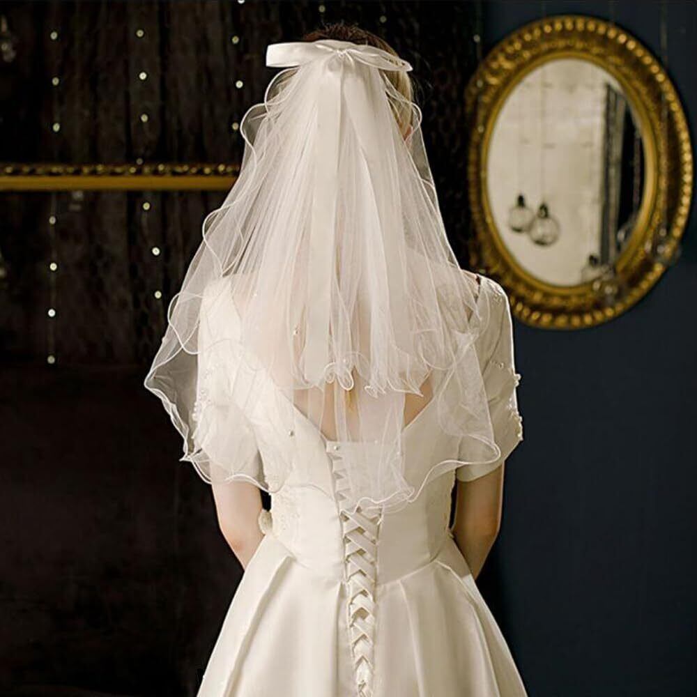 [CHENLONB] ベール ウェディングベール 花嫁ベール 可愛い パール 蝶結び付き波打つ縁 ウエディングドレスの飾り用品 写真 舞台劇 2層ウエディングベール 約60-80cm