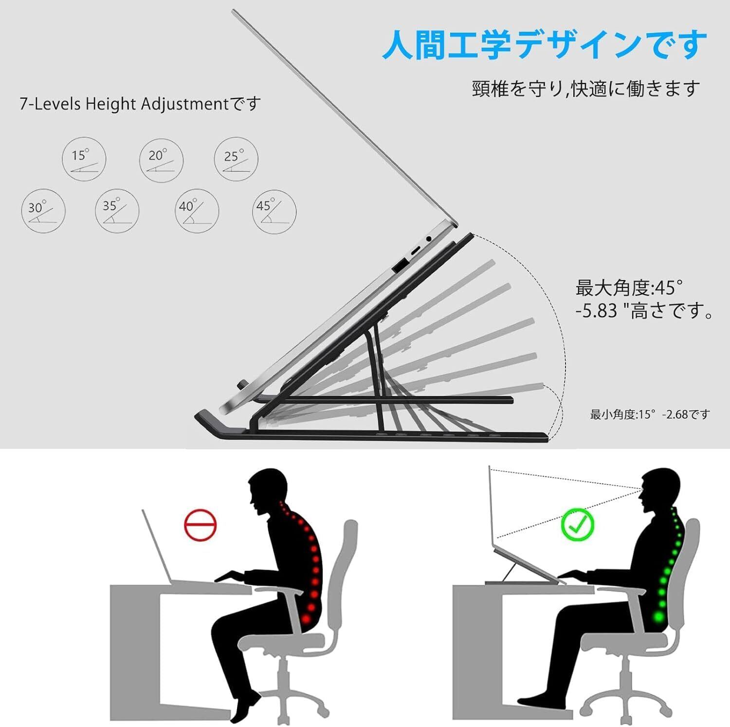【最新人間工学設計】本パソコンスタンドは7段階高さ調整ができ、高さを5~15.5cmまで調節できて、台座の傾斜角度も0~40°まで変えられますので、お好みの高さに合わせることで、猫背を防ぎ長時間のデスクワークでも体への負担を低減します。最適な姿勢を整えて、首、肩、背中などへの負担が軽減されています。