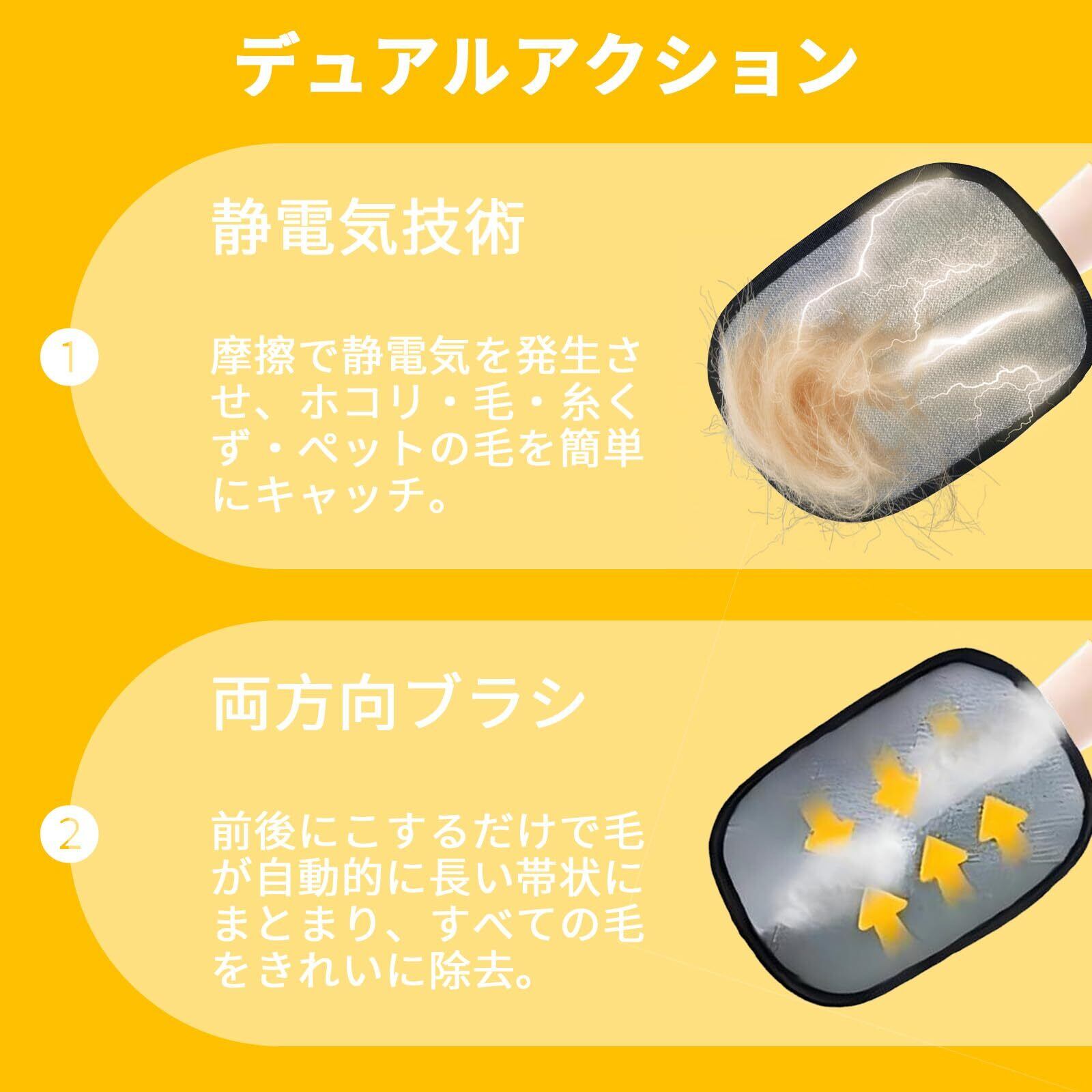 【静電気で驚異の浮き毛キャッチ】特殊繊維が生み出す強力な静電気で、ソファ・カーペット・衣類に深く埋もれた猫犬の抜け毛を根元から吸引。ブラシでは取り切れない微細な毛も逃さずキャッチ!1回の動作で手のひらに毛玉が集合する即効性を実感できます。