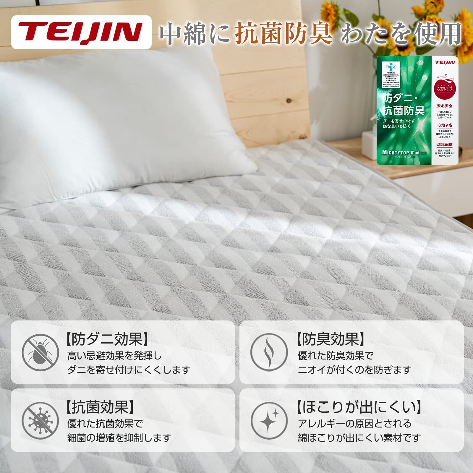 【抗菌防臭・「TEIJIN」の中綿】中わたにテイジンの機能繊維「マイティトップII ECO」を使用する。側生地にはダニを通しにくい加工を施しているので敏感なアレルギー体質の方や小さなお子様にも安心。SEK認証された優れた抗菌防臭効果で、湿気や寝汗などによる菌の増殖を抑えてそれによって引き起こされる嫌なニオイの発生も防ぎます。