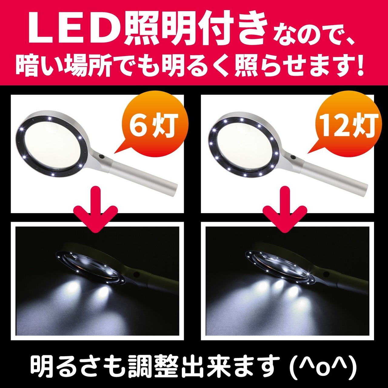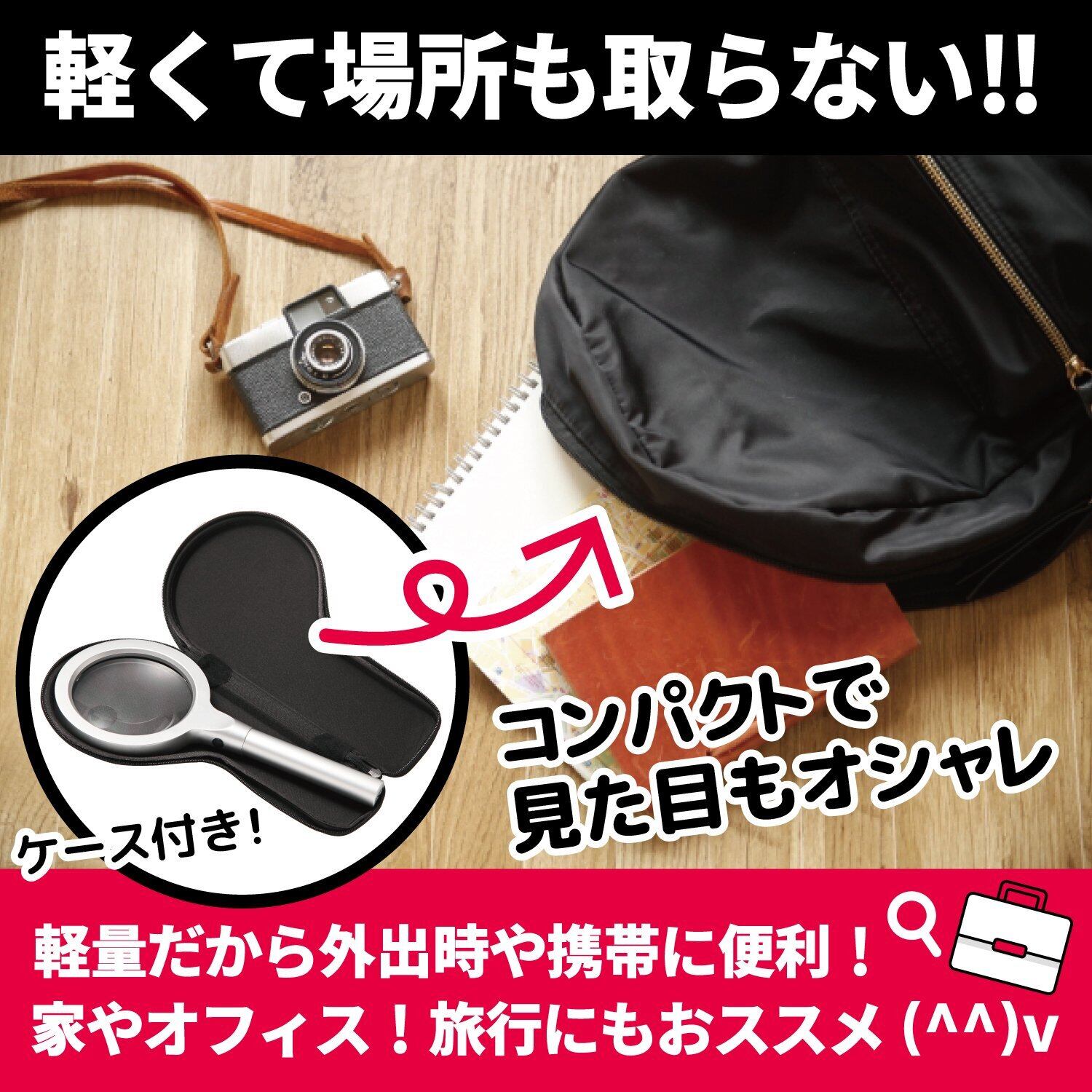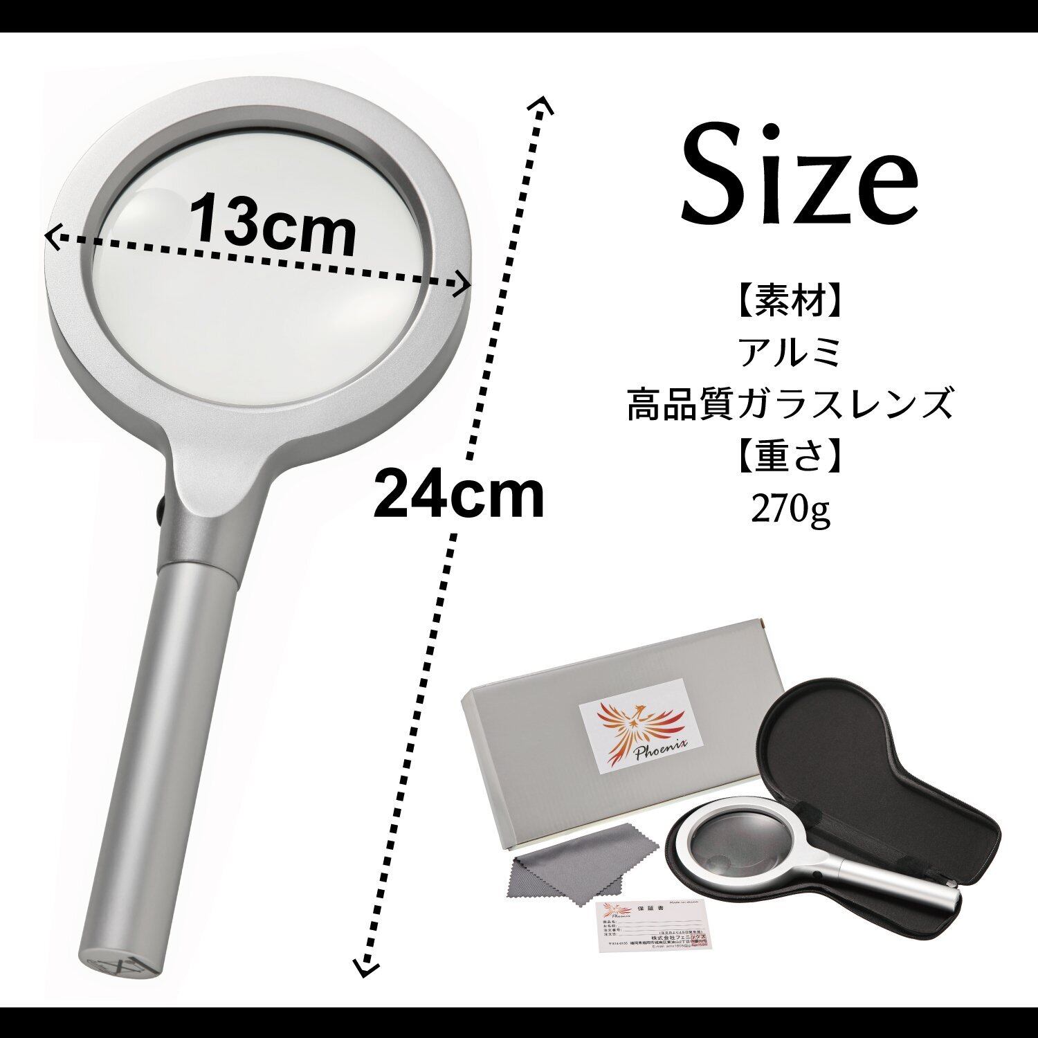 【サイズ】長さ24cm×幅13cm 【素材】アルミ・高品質ガラスレンズ 【重さ】270g【付属品】①ルーペ専用ポーチ ②ルーペ専用クロス ③45日間保証書 【仕様電池】単3電池2本(別売り) 6灯または12灯の2段階明るさ調節可能LEDライト付き※電池は付いておりません。