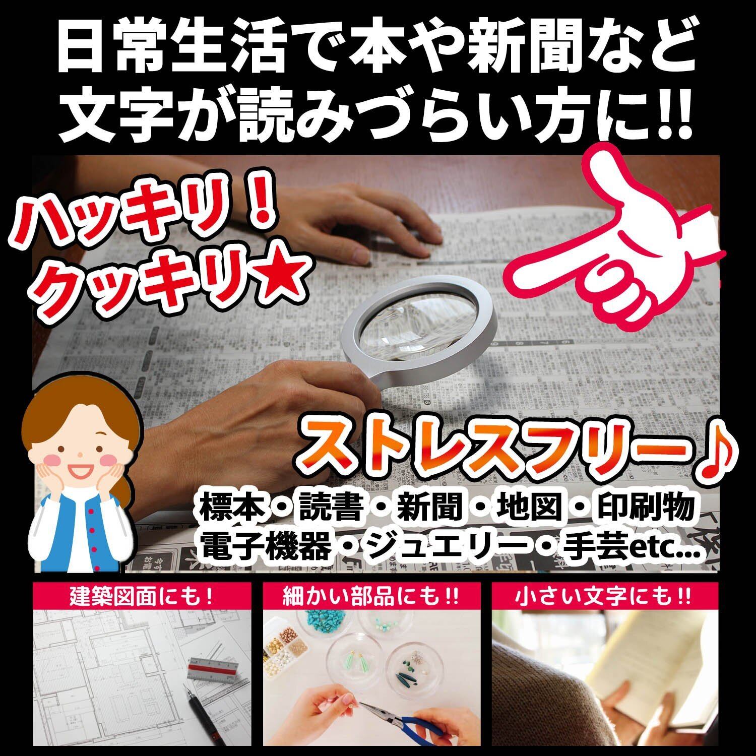 【コンパクトで便利】新聞や地図など、細かい字を見る時はもちろん、夜寝ているご家族の横で調べ物や読書したい時にあるとやっぱり便利!手芸やジュエリー制作などの緻密な作業や、繊細な部分の仕上げチェックにはルーペメガネの代わりとなって、LEDライトと虫眼鏡のコンビが仕上がりを変えるでしょう!他にも、子どもの手に木のささくれが刺さった時のとげ抜きや、天眼鏡として趣味で手相なんて始めちゃうかもしれませんね!