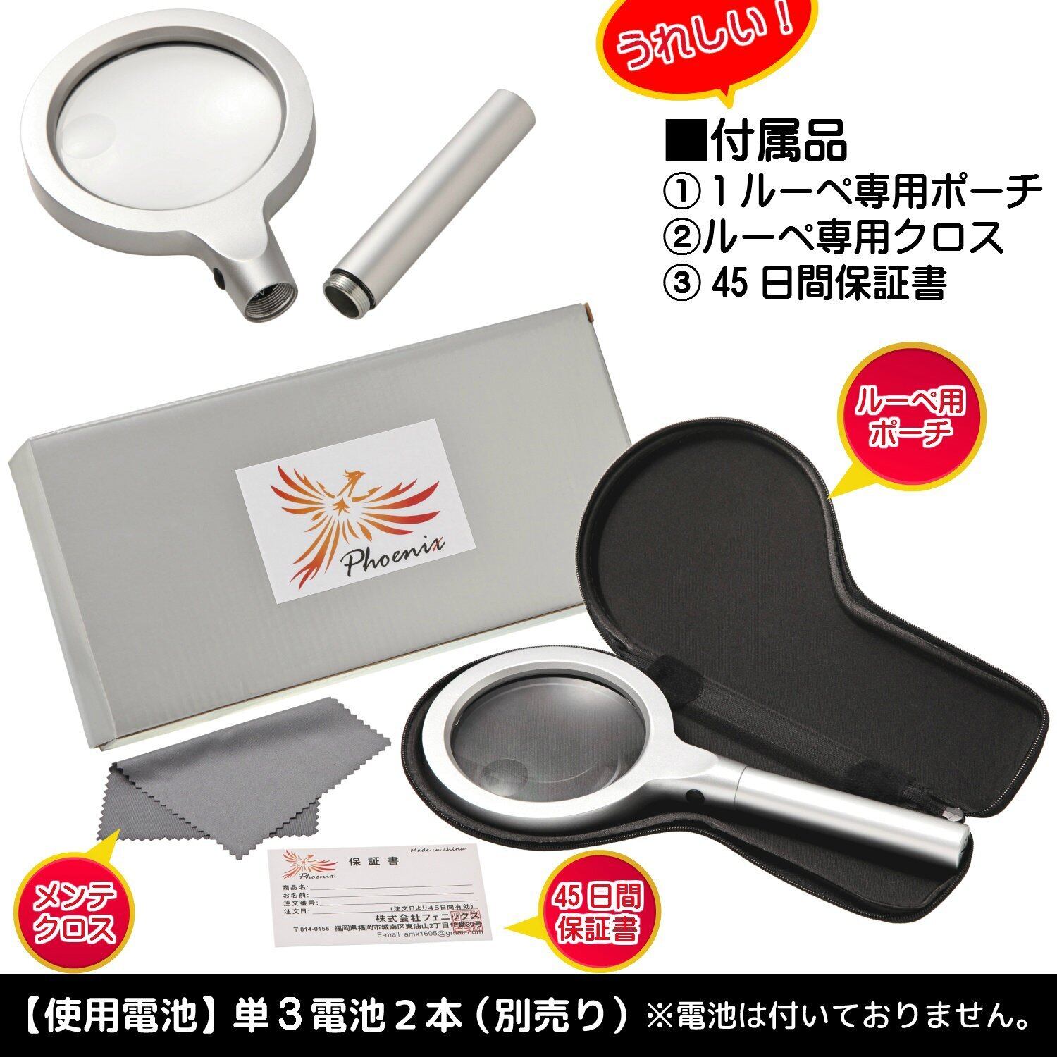 Phoenix 拡大鏡&虫眼鏡 手持ちルーペ【3倍&8倍】2種類レンズ/LEDライト/メンテナンスクロス付き/収納用ケース付き <長期保証45日間> 拡大鏡 ルーペ