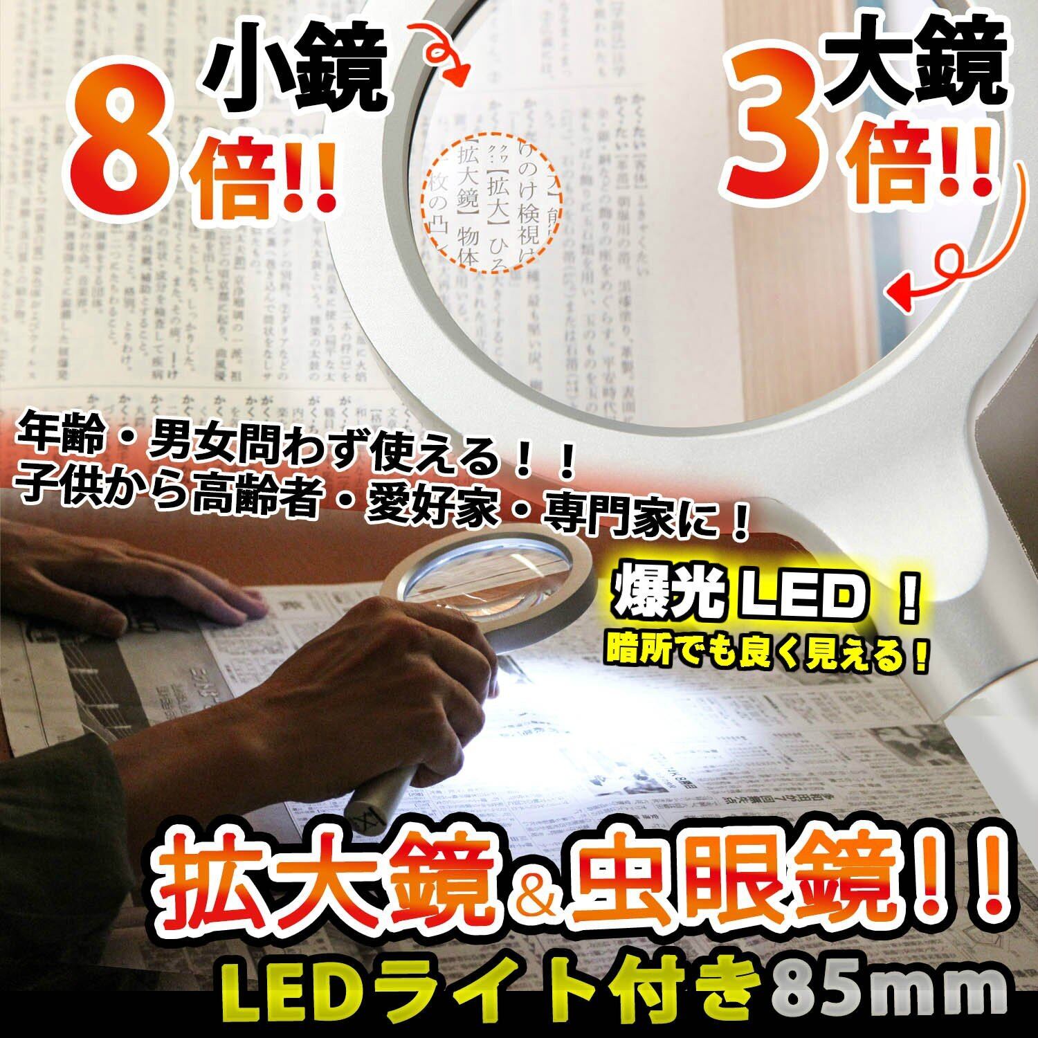 【LEDライト付き・拡大鏡&虫眼鏡】暗い!ぼやける!細かい!その見えないイラ立ちを解消してくれるこのルーペ、日ごろの不便に応えてくれる万能拡大鏡なんです!3倍ズームの大鏡と8倍ズームの小鏡、2段階で明るさ調節可能なLEDライトを備えたこの拡大鏡は、使う場所も、使う時間も、使う人も選ばない大変優れた1本です!子供の自由研究の観察用に、おじいちゃんおばあちゃんへのプレゼントにも喜ばれますよ!
