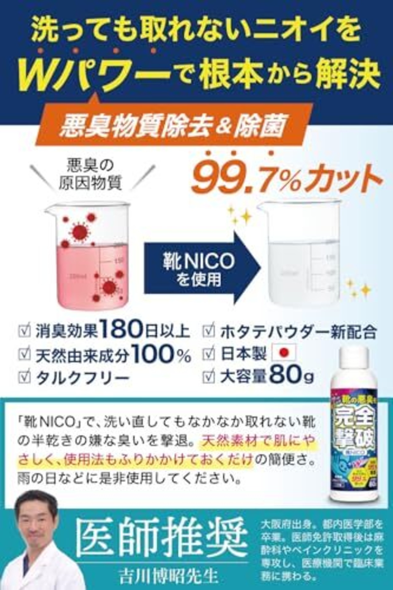 【日本製 大容量80g】靴 消臭【医師推奨】【靴の悪臭菌を99.7%カット】 臭い消し 粉 パウダー 除菌 無香料 靴NICO