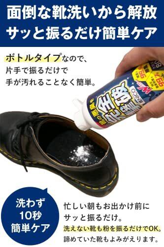 【使用方法】靴の中にパウダーを1~2回振り入れ、上下左右に靴を動かし、パウダーを靴の中全体に馴染ませます。靴を履くと汗でパウダーが溶け、消臭効果を発揮します。