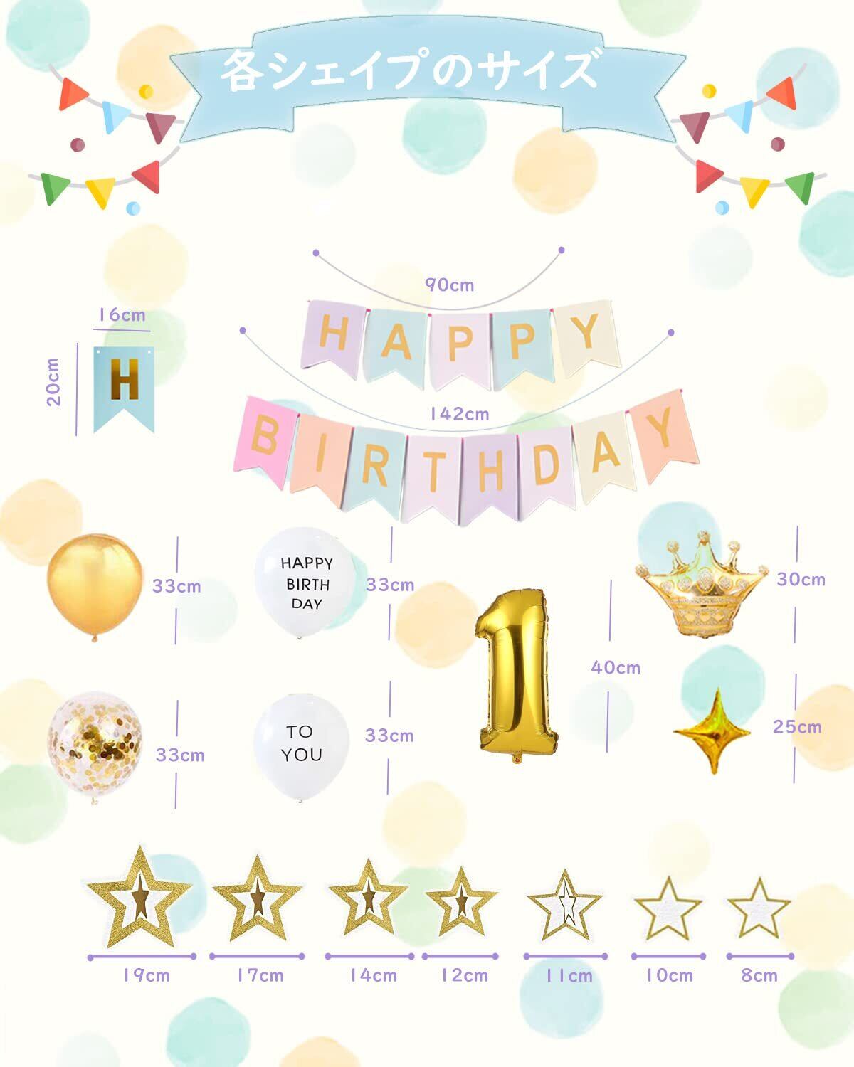 輝くセット&数字バルーン&お買い得:キラキラしている 誕生日 飾り付け セット&新しい風船セットを追加!!!セット内容:①「HAPPY BIRTHDAY」ガーランドバースデーガーランド×1セット ②王冠バルーン×1 ③紙吹雪風船×6 ④数字バルーン×1 ⑤星型アルミバルーン×2 ⑥星のガーランド×1セット ⑦吸込管×1本 ⑧ゴールドリボン×10m ⑨ドットシール×20点 ⑩カスタマーサービスカードx1. 追加風船セットの内容:ゴールド風船×4、HAPPY BIRTHDAY TO YOUバルーン×1セット
