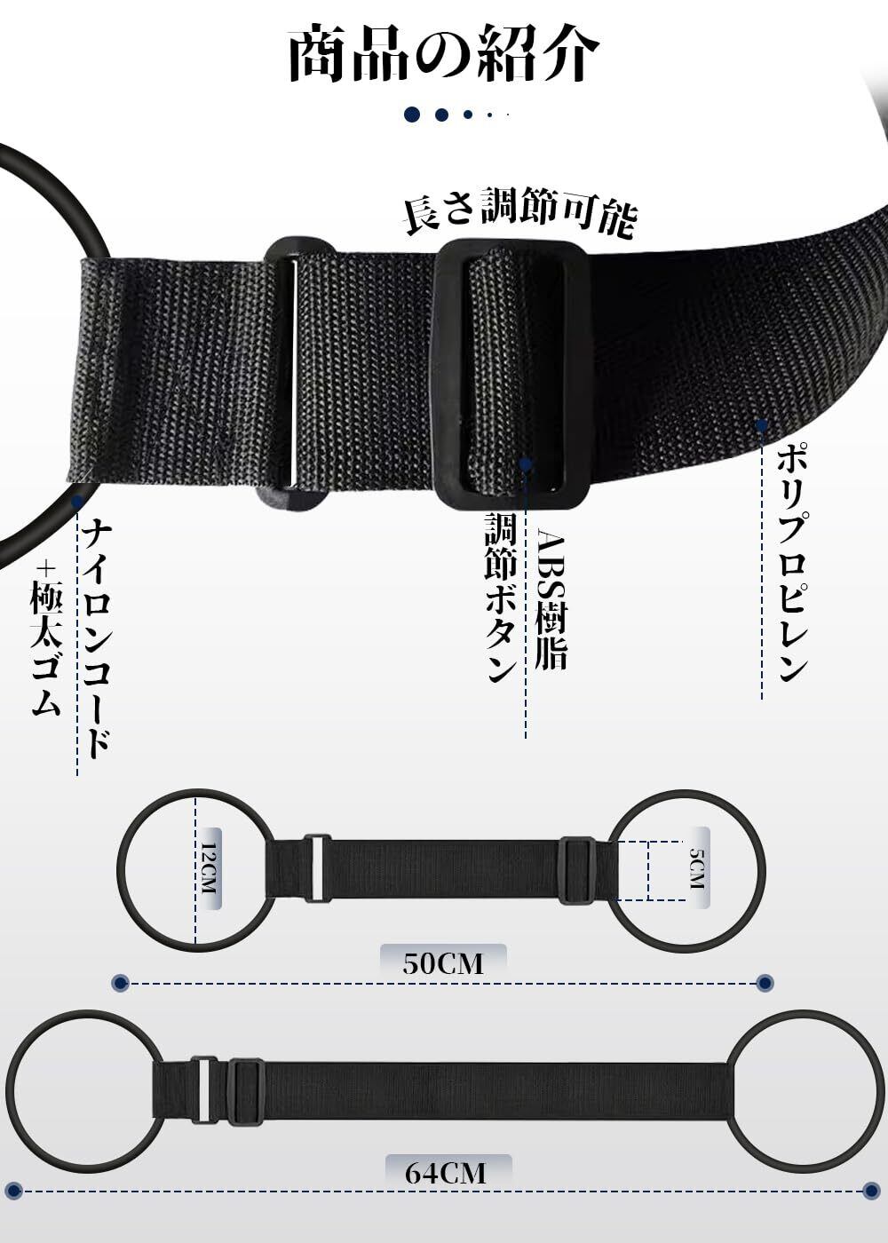 【製品仕様】内容物 :バッグとめるベルト*1本 材質:スーツケースベルト:ポリプロピレン、ゴムABS;ゴム部:直径約12 CM、長さ調整 可能 ( 約50cm- 64cmまで ); ベルト幅約:5cm。金具などがなく、バッグや荷物を傷つけることもありません。