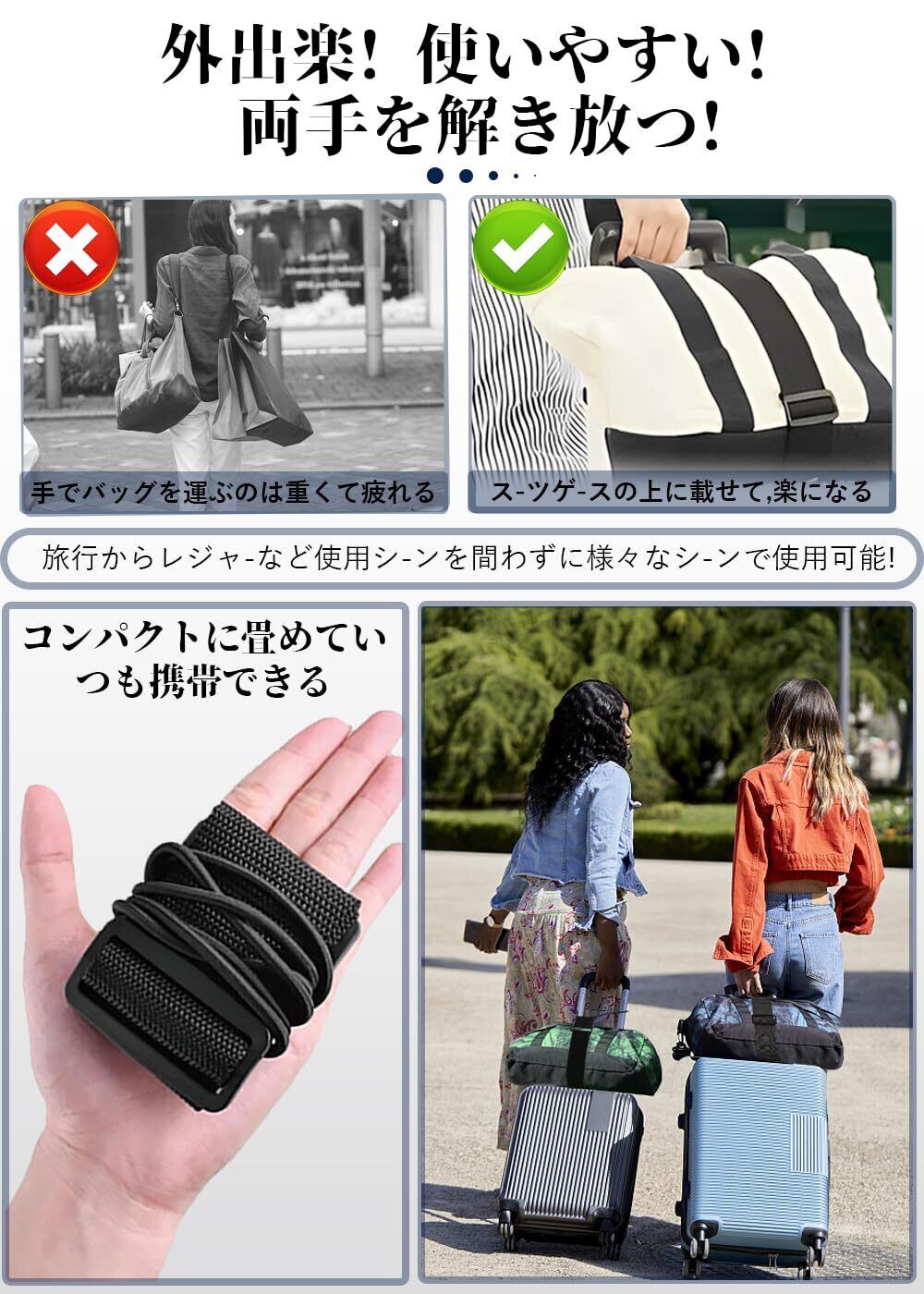 【利用シーン】旅行、出張、引いて越える、アウトドアキャンプなどの場合は、トラベルバッグ・キャリーバッグに荷物を簡単に固定することができます。旅行用キャリーに使用可能です。国内旅行海外旅行電車飛行機の移動時にカスタバークを持っていくときに役に立ちます。使わないときは畳で旅行バグの中にしておくためのコンパックさも人気の秘密です。