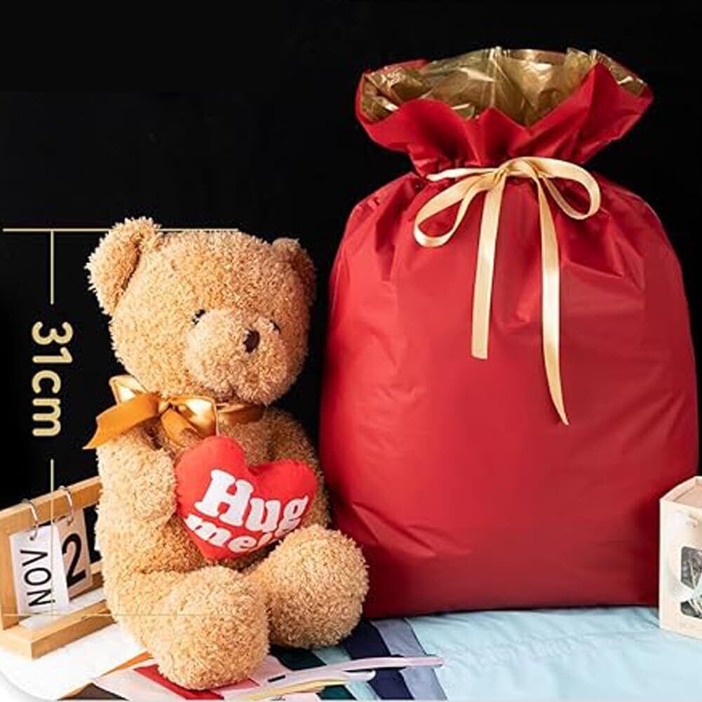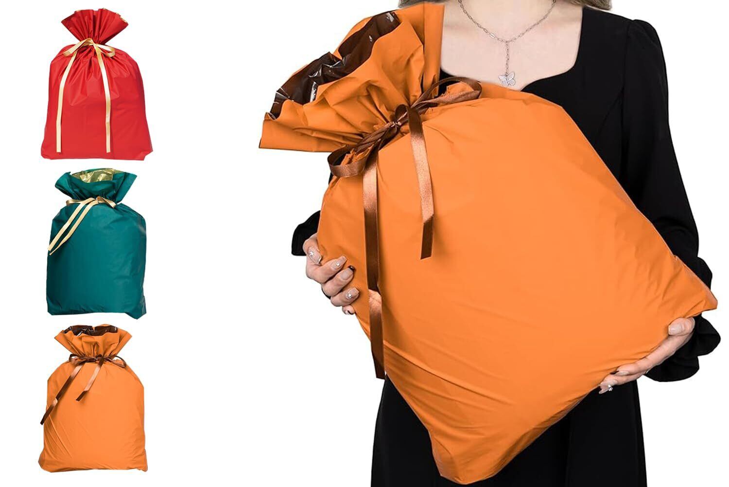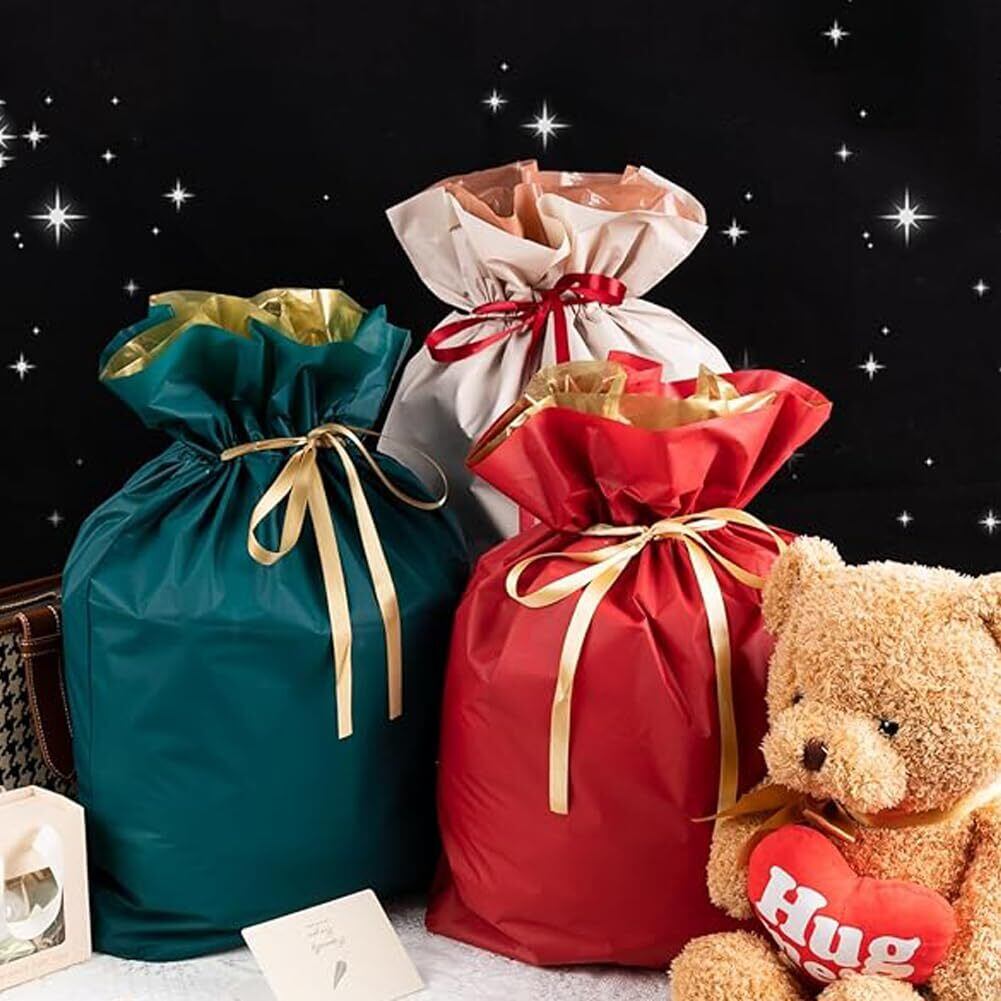ラッピング袋 大きい 【3枚セット】 W450×H560 mm プレゼント 大 バイカラー 巾着袋 ギフトラッピング 贈り物 プレゼント用 包装 バレンタイン 誕生日 ギフト ギフトバッグ ギフト袋 ラッピング用品 リボン付 クリスマス ハロウィン (赤+緑+オレンジ)