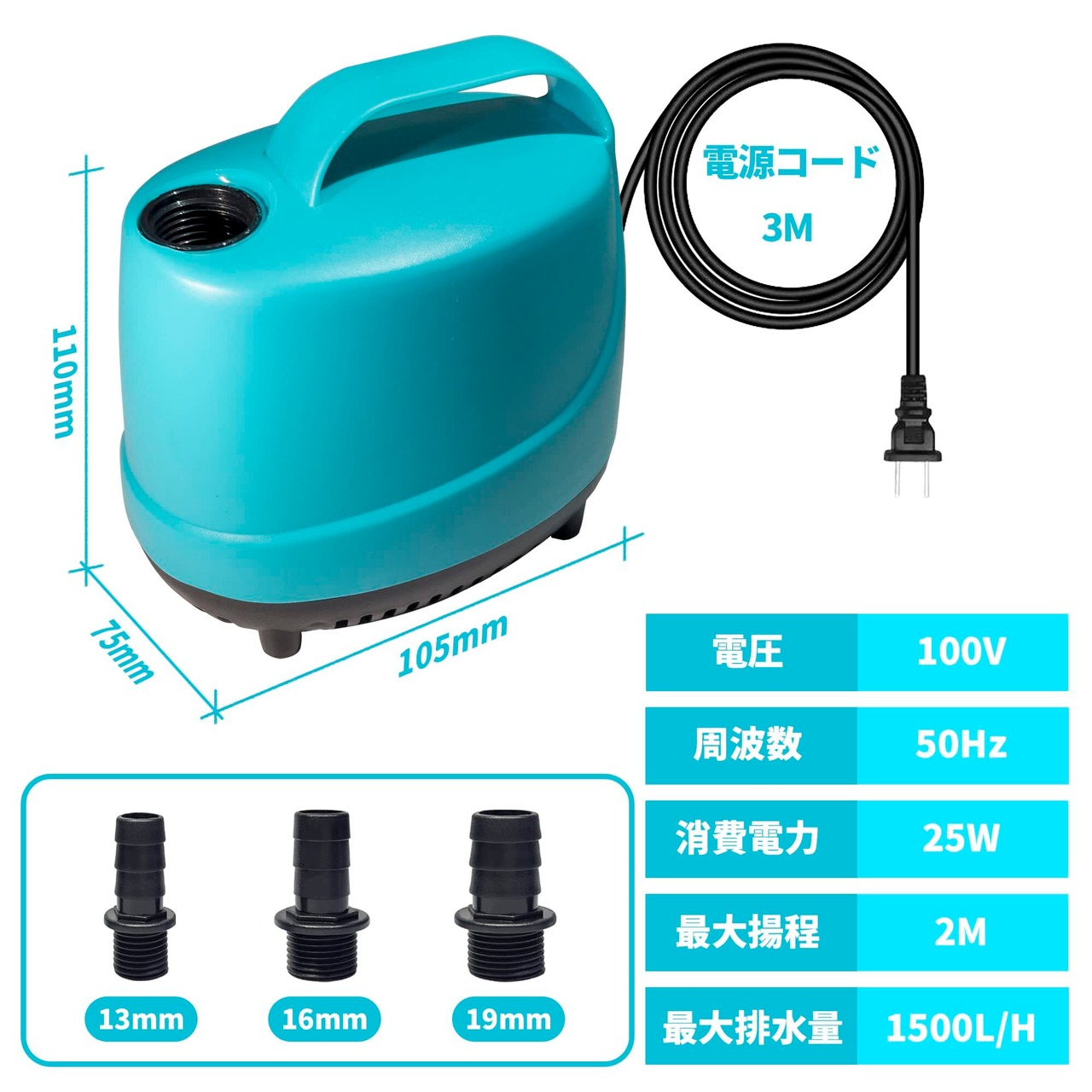 電源:AC 100V 周波数:50Hz 消費電力:25W 最大吐出量:1500L/H 最大揚程:2M 防水:IPX8 海水対応:可