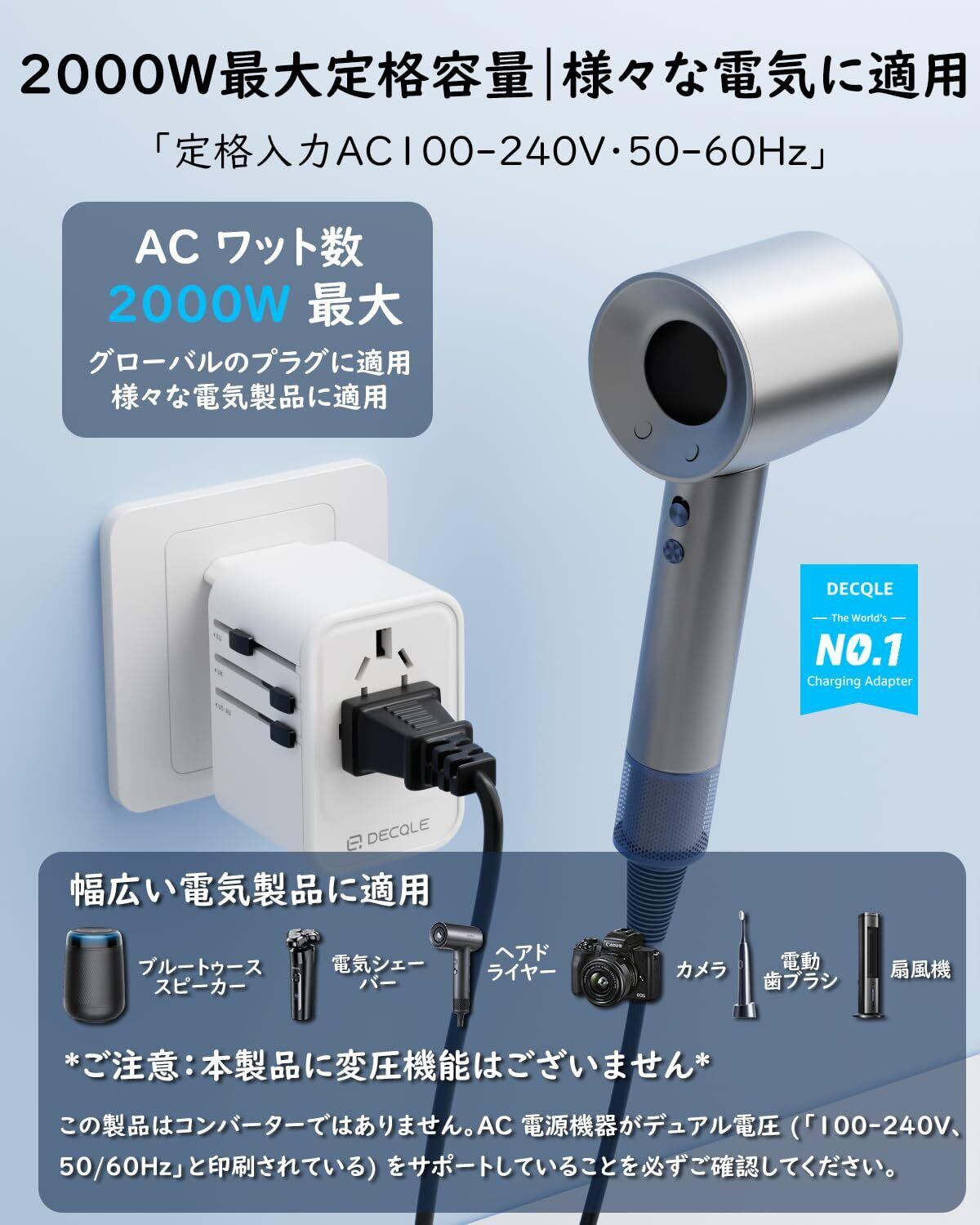 [ACコンセントの定格入力] 本製品の定格入力はAC100-240V、50-60Hzです。また、定格容量「または消費電力:W(ワット)数」は最大2000Wであり、高出力の電気製品に適用しています。ヘアドライヤー、カメラ、電動歯ブラシ、扇風機、シェーバーなどの様々な電気製品に当て嵌ています。※「ご注意」本製品に変圧機能はございませんので、ご使用の際は必ず電圧をご確認ください。また、炊飯器、ヘアドライヤーなどの高出力電気製品を長時間に使用する場合は、過熱や過負荷の恐れがあるますので、高出力電気製品をご使用の際にご注意してください。