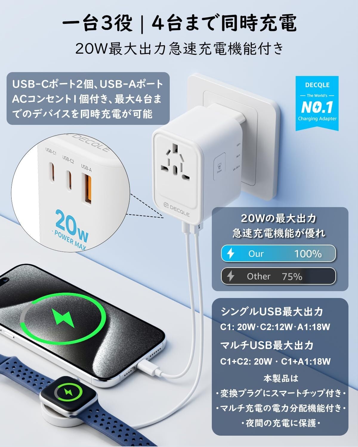[一台3役、USB-C×2&USB-A×1] PD 20Wの最大出力はスマホやスマートワッチなどのデバイスに急速充電ができます。本製品はUSB-Cポートを2個、USB-Aポートを1個を内蔵しており、およびACコンセントは最大4台までのデバイスを同時充電が可能です。また、変換プラグに内蔵しているスマートチップは、複数のデバイスを同時に充電する際に、自動的に電力を分配し、夜間に充電する場合にもデバイスを保護しています。