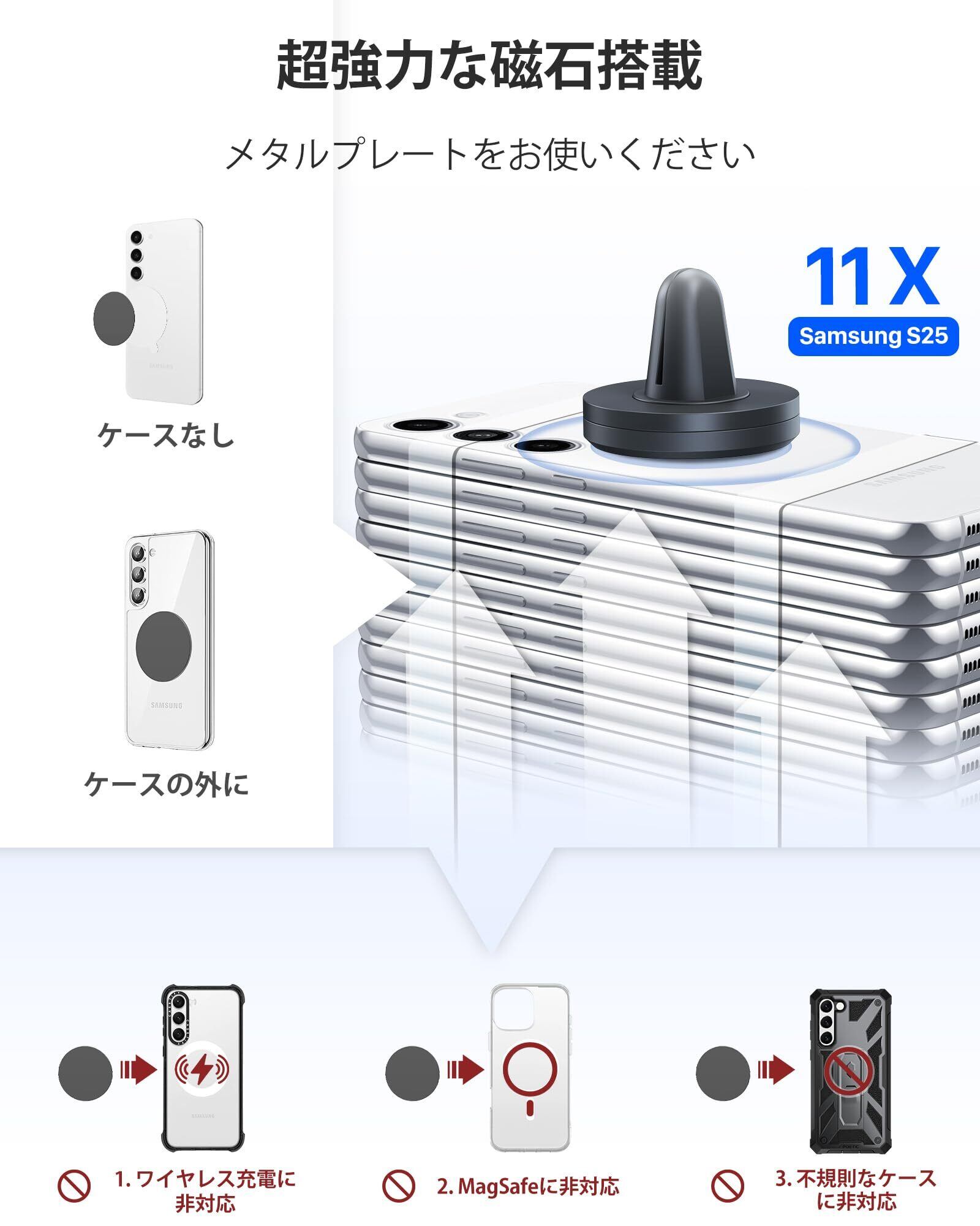 [Magsafe非対応]:本スマホホルダーを使用する前に、メタルプレートをスマホまたはスマホケースの裏面にお貼りください。iPhone 16/15/14/13/12シリーズをご使用の場合も、必ずメタルプレートをご利用ください。ワイヤレス充電に影響を及ぼす可能性があるため、ご了承ください。Magsafe適合版が必要な方は、「新しいモデル」セクションをご覧ください。