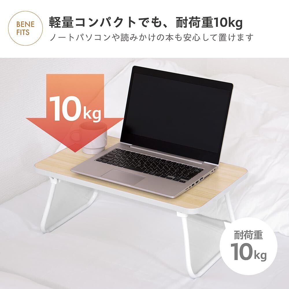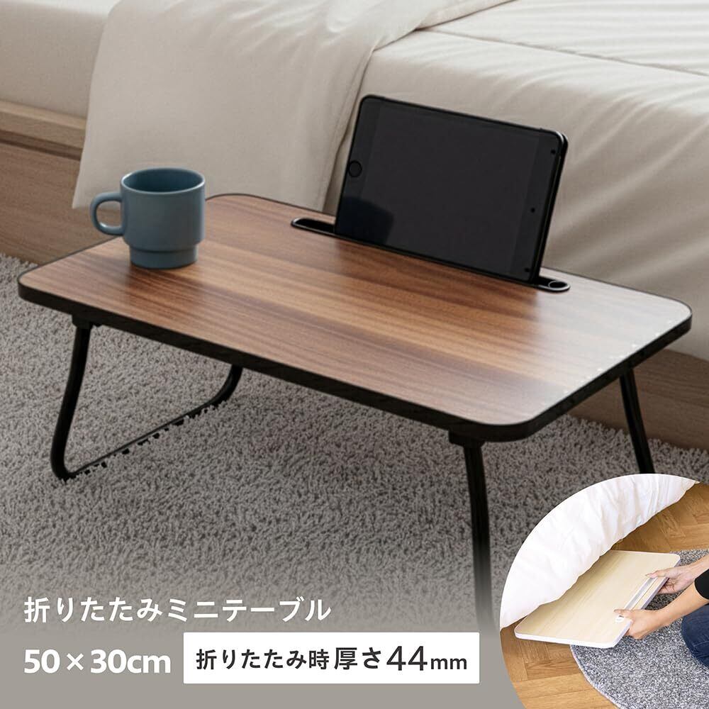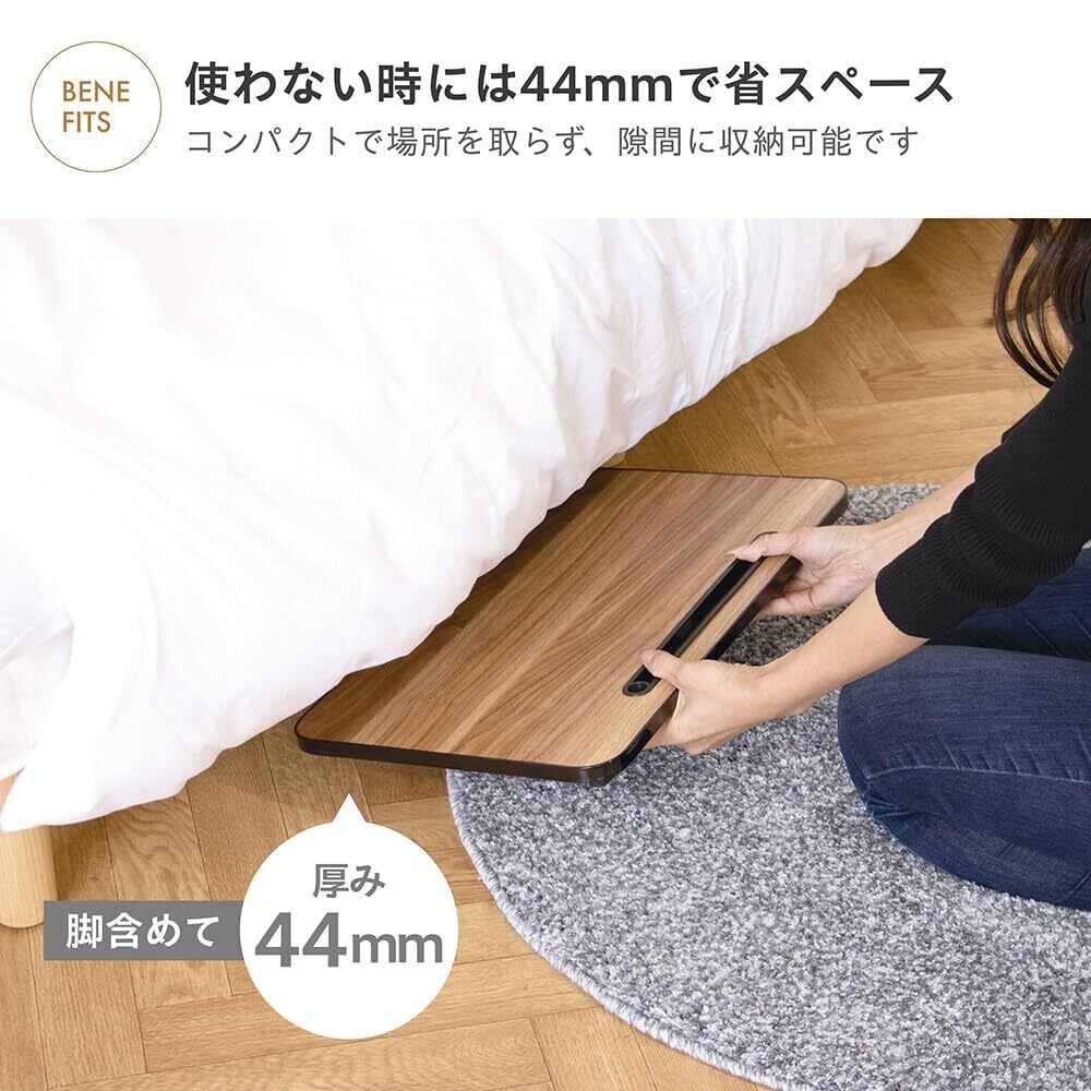 【使わない時はすっきりと超スリム収納】 使用後はワンタッチで脚を折りたためる構造で、手間なく片付けられます。折りたたみ時の高さはたったの4.4cm。使わない時は家具の隙間にスリムに収納でき、生活スペースを邪魔しません。耐荷重は10kgと、ミニサイズながらしっかり使えます。
