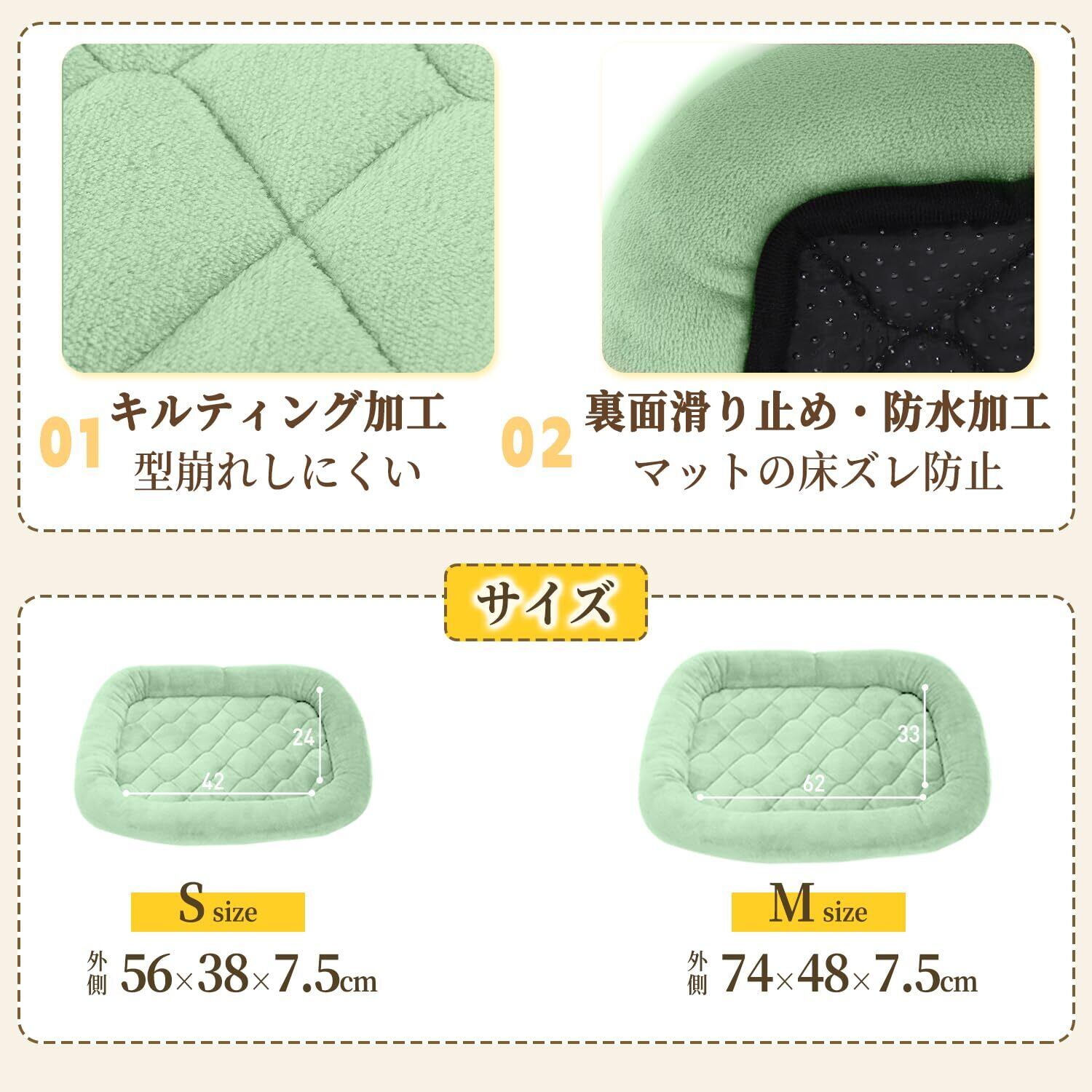 【オールシーズン使える】夏はマットの上に冷感マットを敷き、冬は保温性があるフランネル生地で、季節を問わずオールシーズンお使いいただけます。【キルティング加工】中央部分は中わたが偏らないキルティング加工することで、型崩れしにくくなっています。しっかりと縫製は丈夫で噛みついても破れにくいで、耐久性が抜群です。