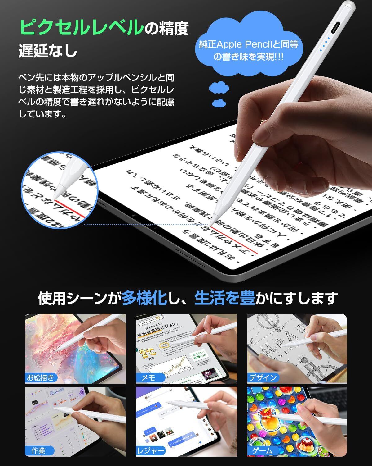 KINGONEタッチペン スタイラスペン 超高精度 【 2026 革新版 全機種対応 超高速充電】1MM極細 アップルペンシル互換ペン 誤ON/OFF防止/電量表示/傾き検知/二重磁気吸着機能対応 iPad用ペンシル 軽量 耐摩 耐久 iPad/iPhone/Android/スマホ/タブレット対応タッチペン (ホワイト)