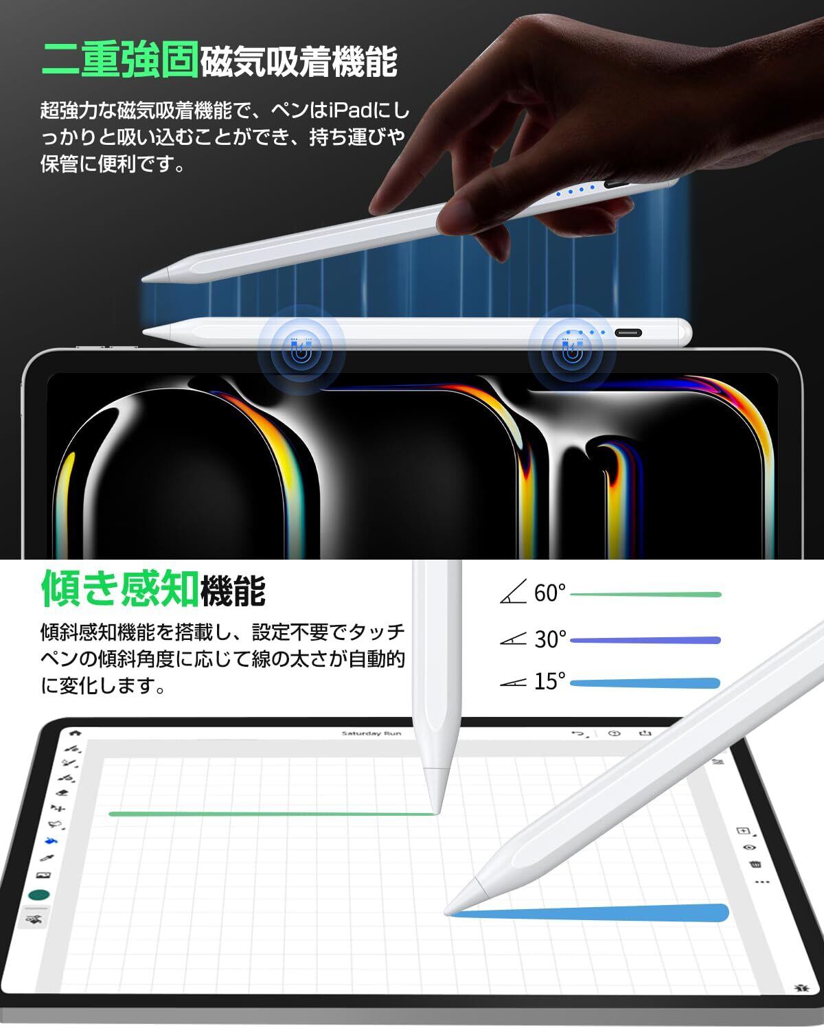 【二重磁気吸着構造 & 使いやすさ】KINGONE iPad用ペンシルは、二重強固磁気吸着機構を採用し、いつでもどこでも安全に使用できます。ノートを取ったり、スケッチのアイデアを練ったりする際に、紛失や置き忘れを心配することなく、便利且つ迅速に作業を行えます。ペアリング不要のスマホスタイラスペンで、Bluetoothフリーなしで簡単に操作でき、スイッチを軽く2回タッチするとON/OFFができます。 4つのLEDを搭載し、バッテリー残量が一目で確認できます。 超軽量13.5gなので、長時間の作業でも手が疲れません。 ※ご注意:磁気吸着機能対応: iPad Pro 12.9"、iPad Pro 11"、iPad Air 第4/5世代、iPad mini第6世代。磁気吸着機能非対応: iPad Pro 13/11 inch(M4)、iPad Air 13/11 inch(M2)、iPad第6/7/8/9/10世代、iPad Air第3世代、iPad Mini第5世代。