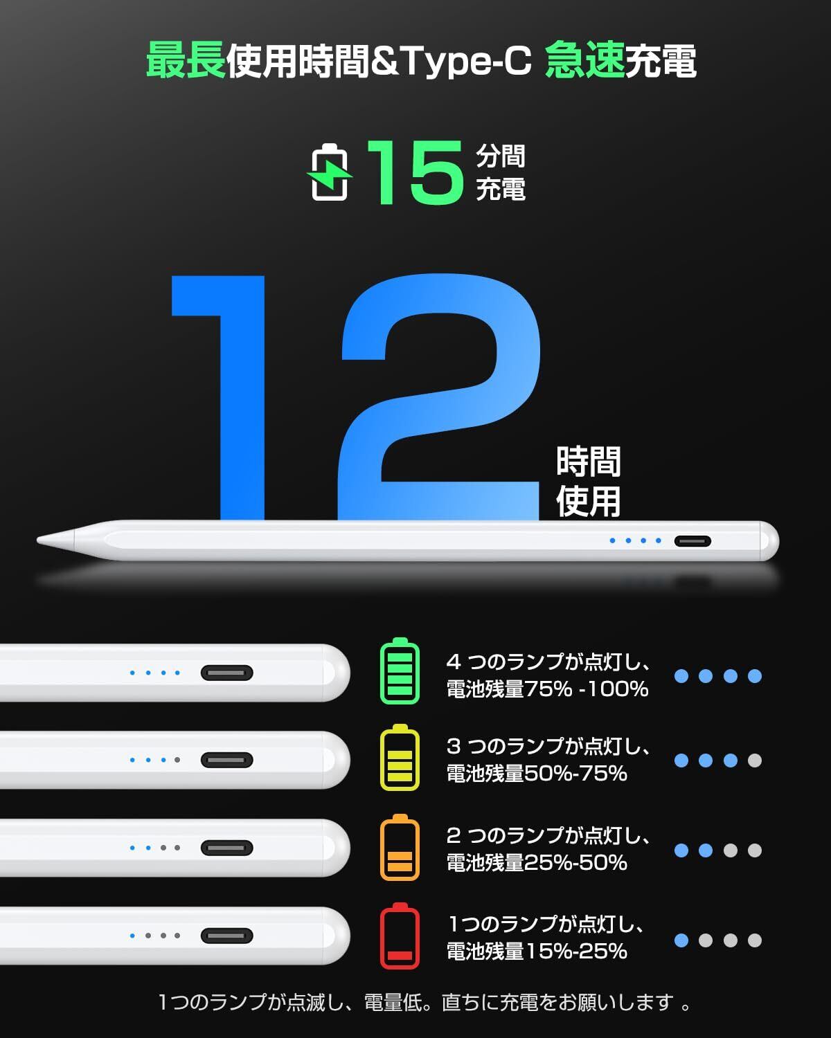 【Type-C超高速充電 & 進化した長時間使用】KINGONE iPad用 ペンは、充電1分で50分、充電4分で2時間使用できます。30分間フル充電でき、12時間連続使用可能、いつでもどこでも取り出して使うことができます。高速充電とバッテリー寿命を楽しんでください、バッテリー切れの心配はありません!(付属品:スタイラスペン×1、日本語説明書×1、替チップ×3、USB変換タイプc充電ケーブル×1)