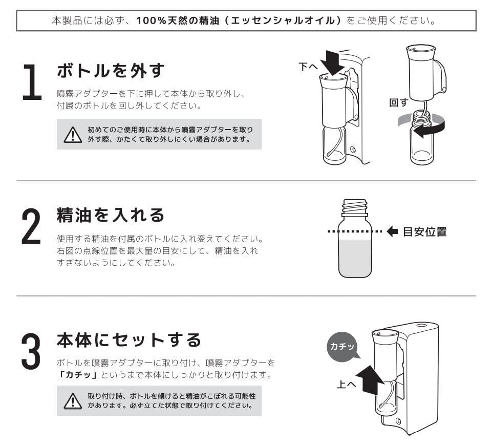 ●本製品には100%天然の精油(エッセンシャルオイル)をご使用ください。※オイルは付属しておりません。市販のお好みのオイルをお買い求めください。