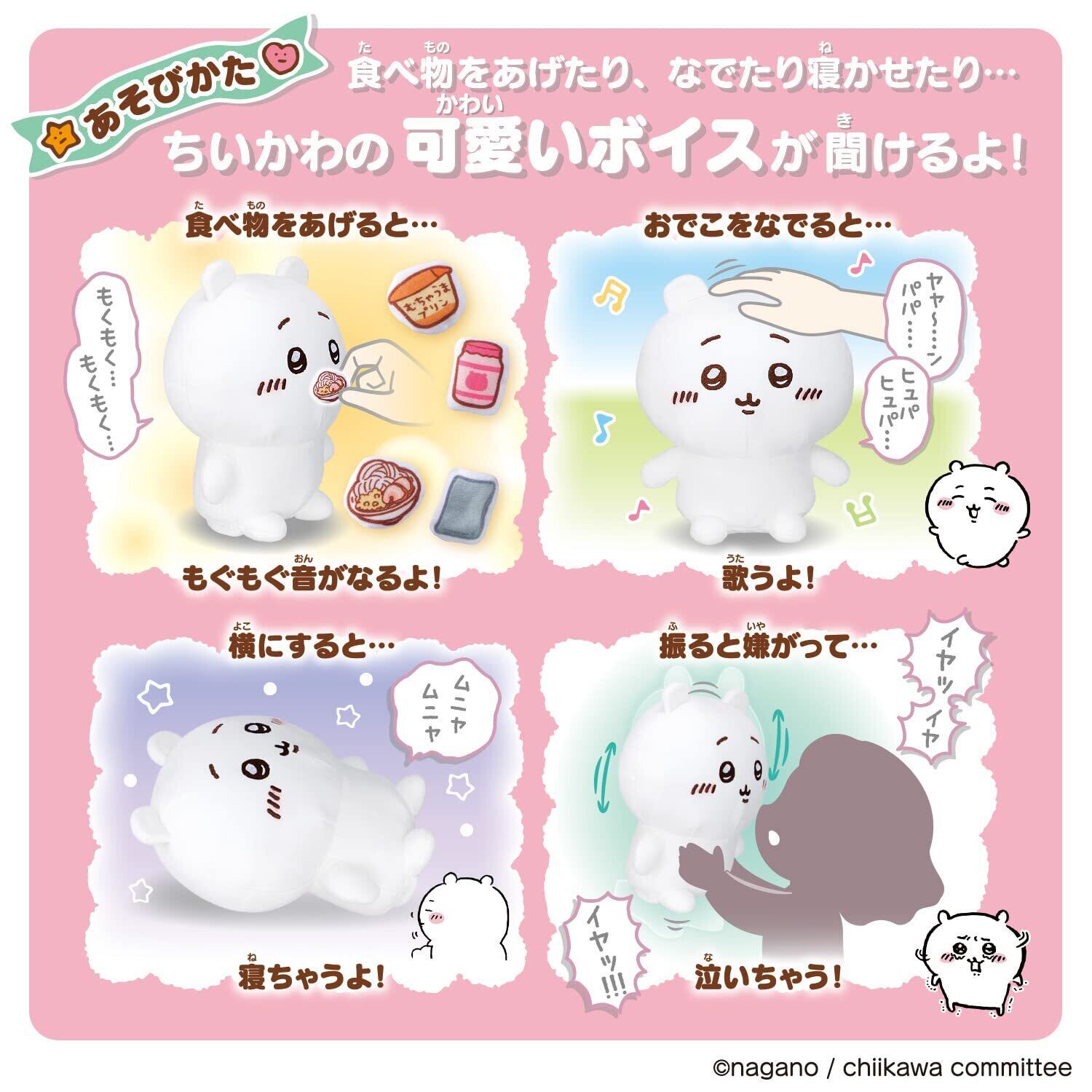 さらに、ご飯をあげると「もぐもぐ音」がしたり、頭をなでると歌ったり、寝かせると「ムニャムニャ」眠ったり、 上下に振ると「イヤッ」と嫌がるなど、ちいかわらしい可愛いリアクションを楽しむことができます。