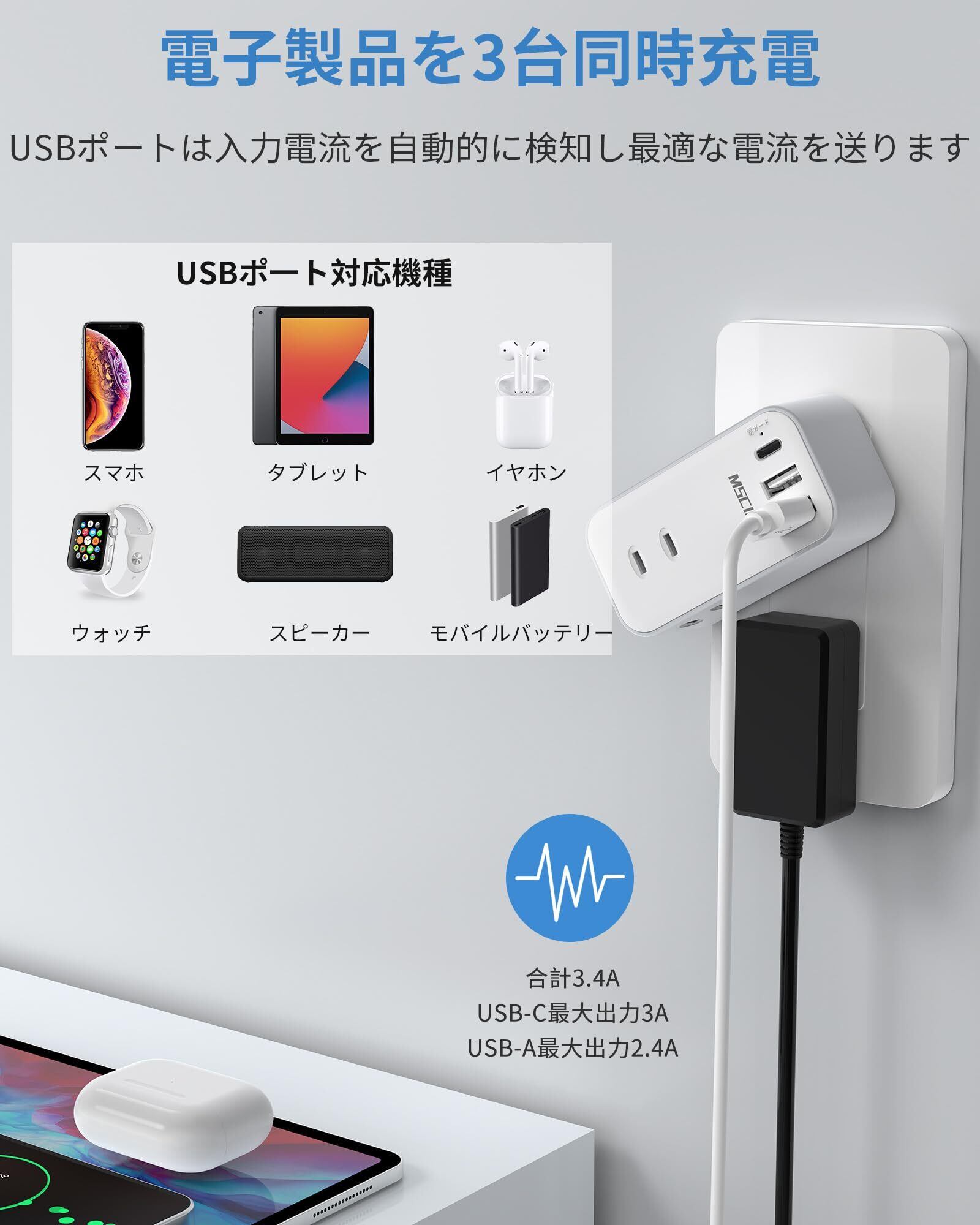 「便利なusb充電タップ」USBポート合計出力3.4A、単一USB-Cポート出力3A(Max)、単一USB-Aポート出力2.4A(Max)。USBポートには接続機器の端末を自動で判別し、スマホとカメラなど、それぞれの機器に合わせた最適な出力で充電します。