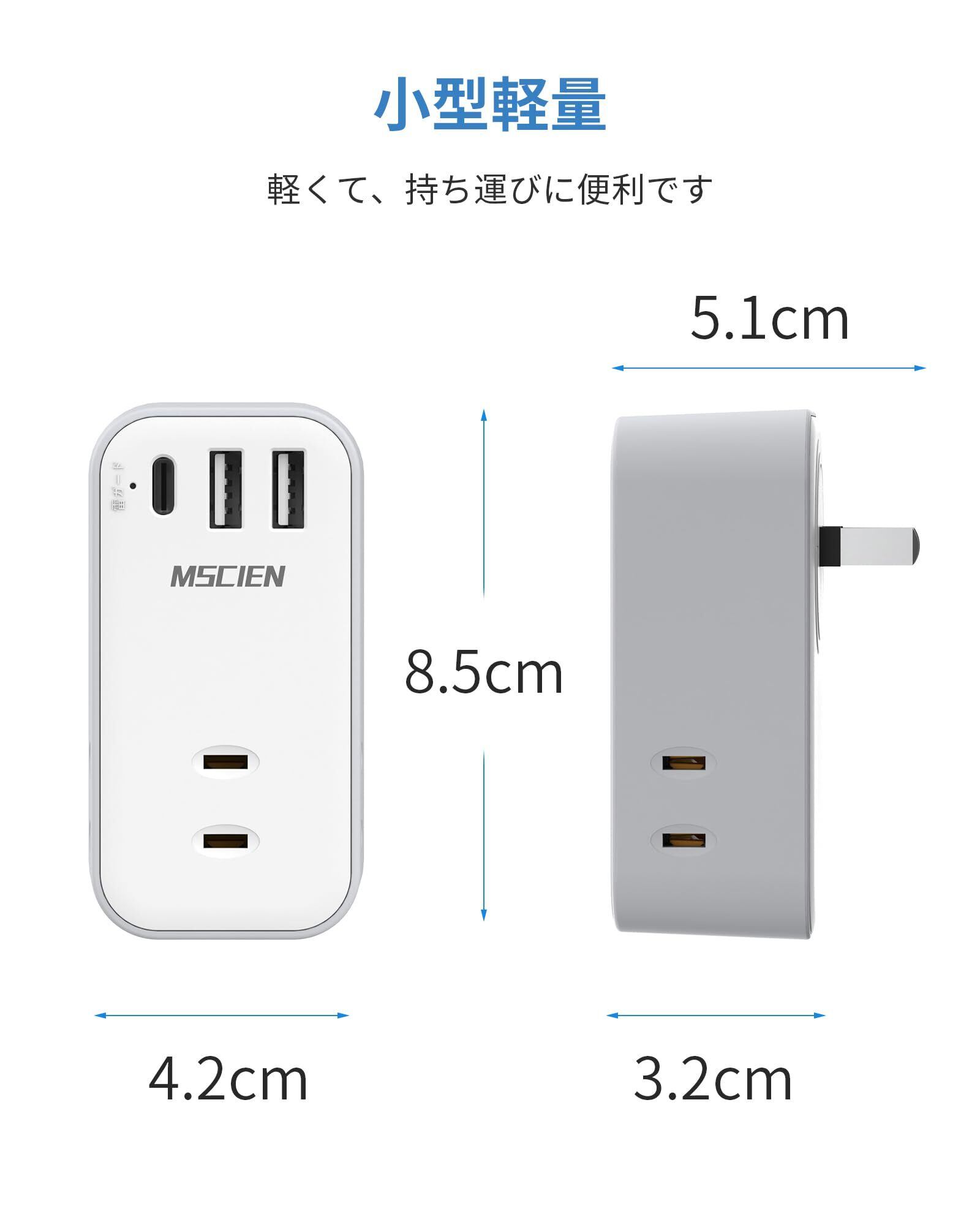 「小型軽量なタコ足コンセント」85*42*32mmのサイズで、カバンのスペースを占めません。コンパクトのusb 充電器として自宅だけでなく、旅行や出張などの外出際にもご携帯頂けます。