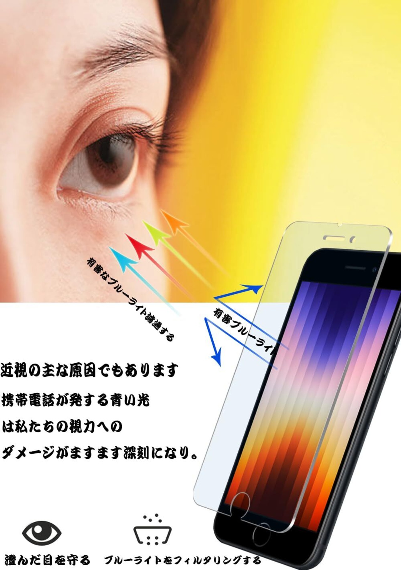 【ブルーライトカット護眼】iphone se3 フィルム 専用 最新反射技術で 93% ブルーライトを効果的カット,長時間使用の目疲れを軽減し視力を守り、近視予防に役立ちます。ブルーライトカット特殊構造上、視角により画面が淡い黄 / 青紫色になるのが正常現象で、予めご了承ください。