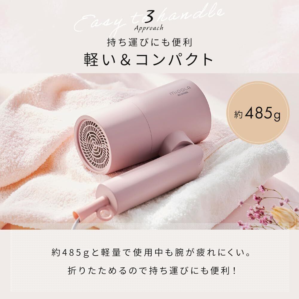 【軽い&コンパクト】持ち運びにも便利な軽くてコンパクトなドライヤーです。重さは約485gと500mlのペットボトルより軽く、ドライヤーの重さによる使用中のストレスを軽減します。さらに使用しないときは折りたたんでコンパクトに収納できます。また旅行の持ち運びにも最適です。