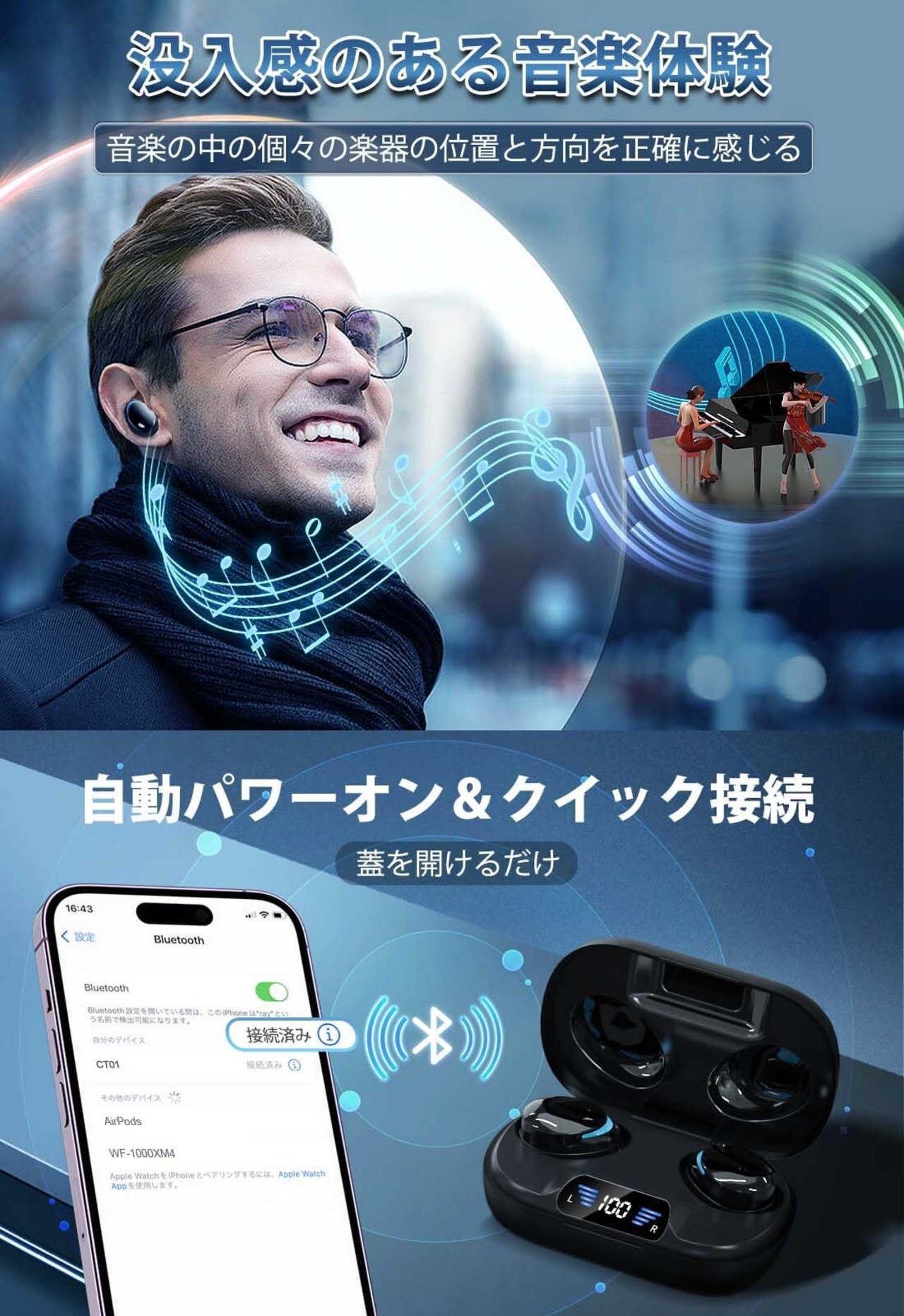 【✨簡単操作でストレスゼロ】 ケースを開けるだけで接続が完了する便利な設計。タッチセンサーを使えば、再生、一時停止、曲送りなどの操作が簡単に行えます。さらに、日本語音声ガイド付きで、初めての方でも安心して使用可能。直感的な操作で、忙しい日常の中でも快適に使えるようにデザインされています。