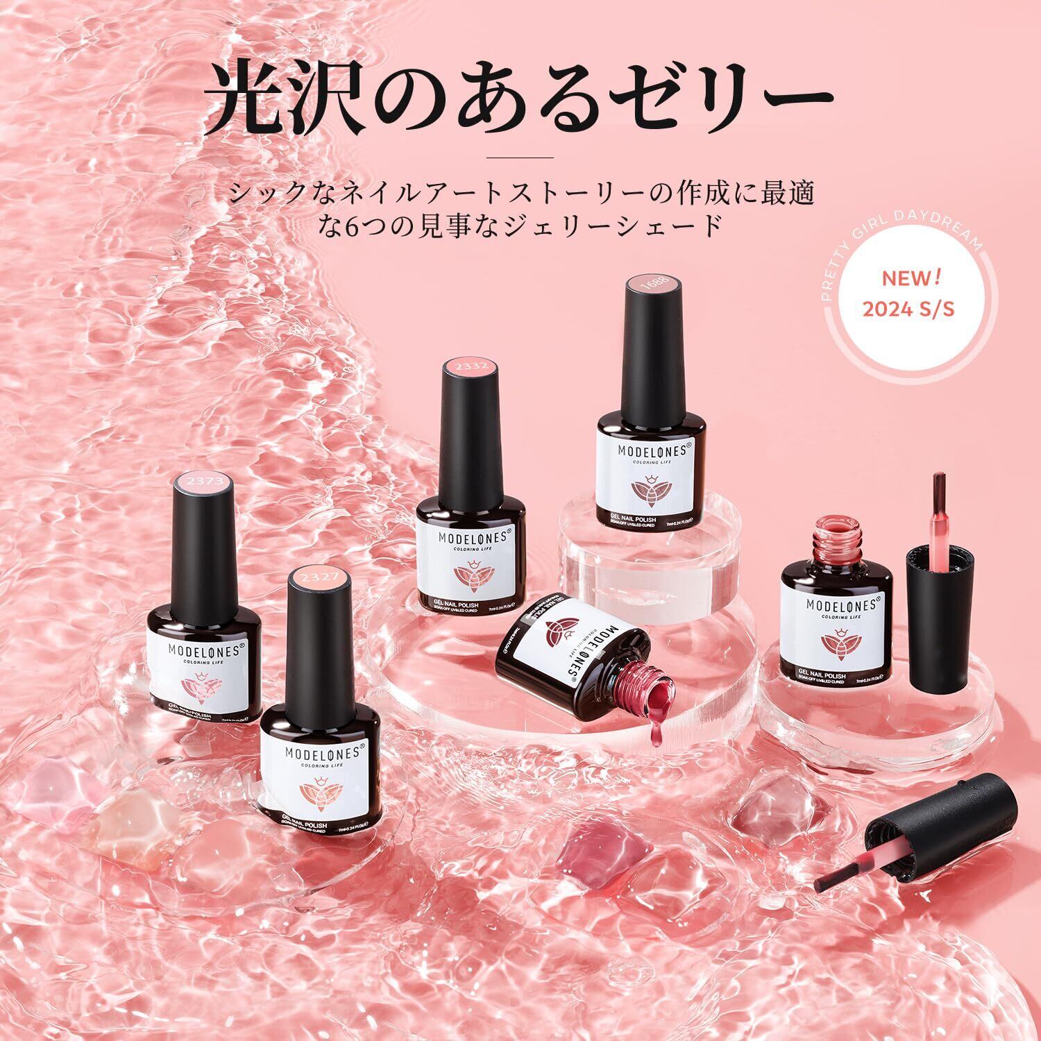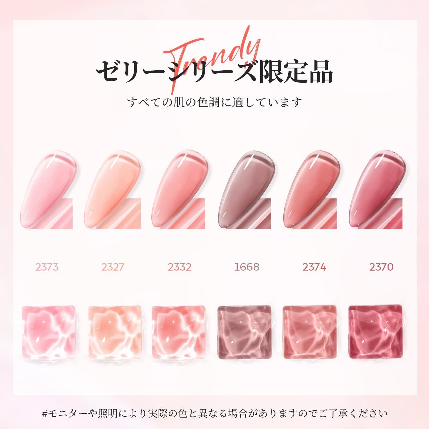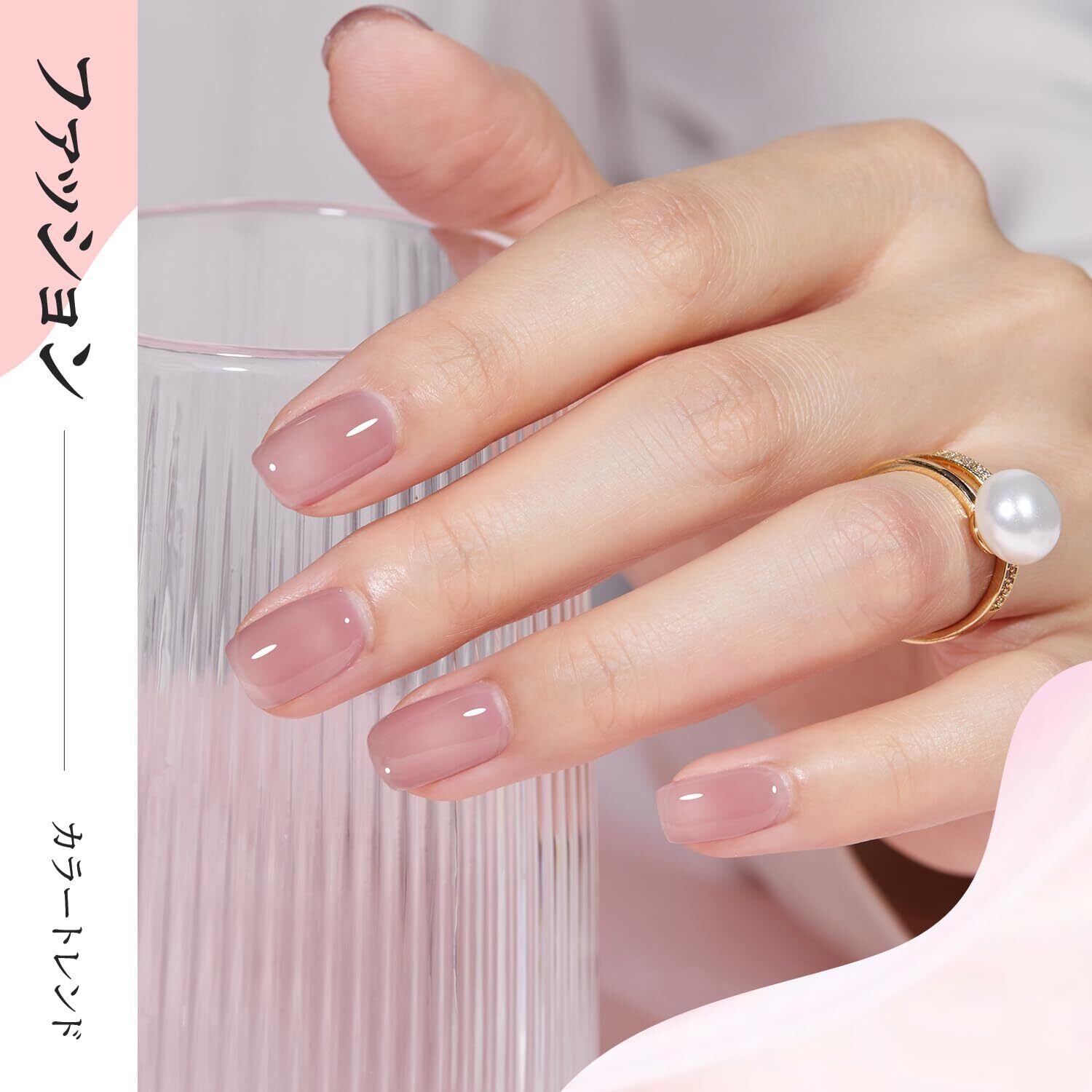 ジェルネイル 透け感:薄く塗るジェルネイル、ゼリーのようなみずみずしい透明感。厚塗りや2~3度塗りでしっかり発色。塗り方や塗布量を変えて、お好みのカラーに仕上げることができます。通学、結婚式、イベント、入学式、オフィスと日常など様々な場面に、ごキラキラ可愛いに