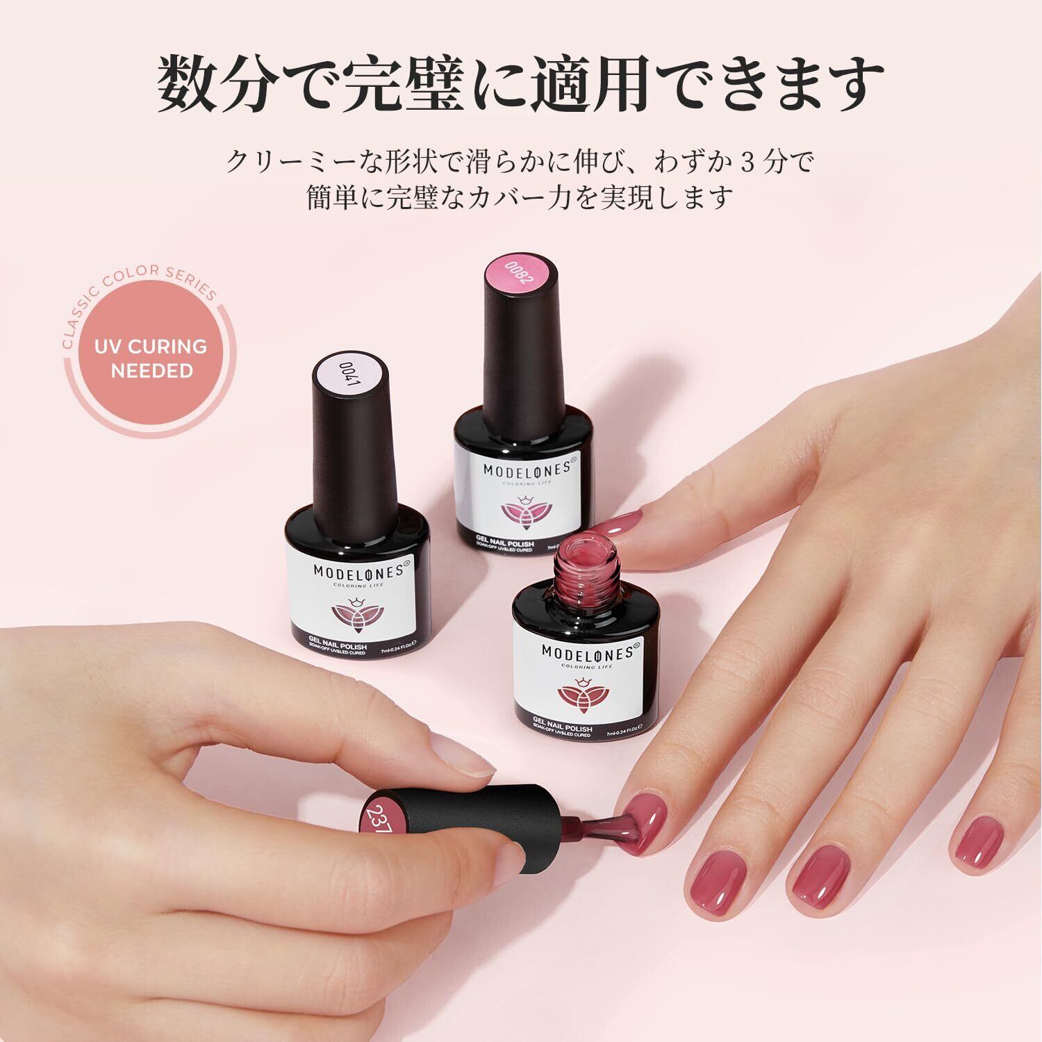 UV/LEDライト対応:UV/LEDライトで硬化必要です。 硬化時間目安:36W UVライト:約120秒 / 36W LEDライト:約60秒。ヒント:ご使用になるライトや塗布量によって多少の増減はあります。カラー見本と実際の色にはディスプレイなどにより異なって見える場合がございます。 予めご了承くださいませ