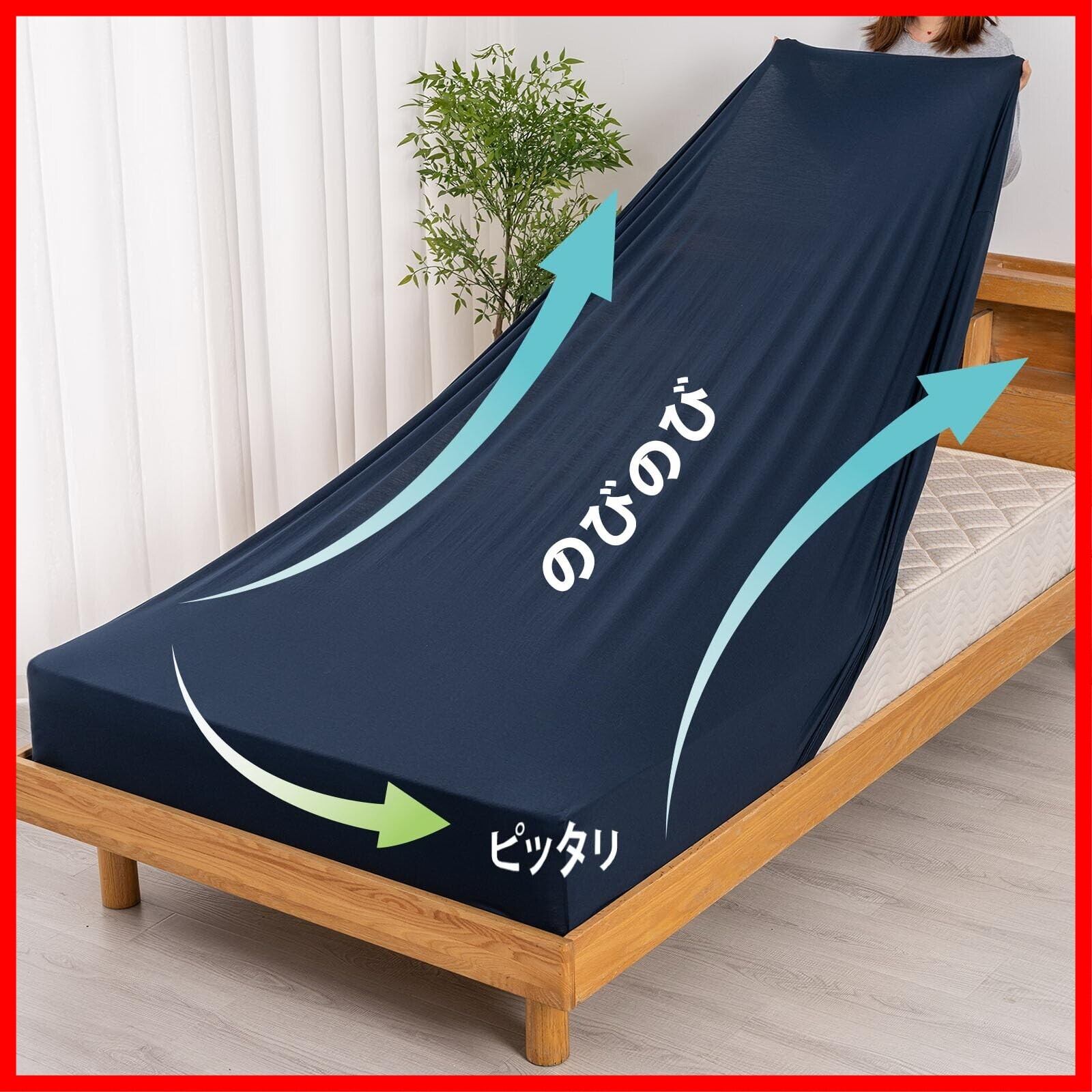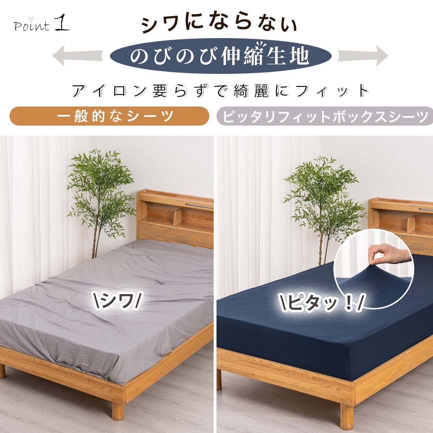 【超のびのびシーツ】伸縮性に優れたストレッチ生地を使用しており、タテ・ヨコにしっかり伸びるため、シワになりにくく、シーツが浮かずに美しくフィットします。ボックスシーツの全周には高品質のゴム糸を織り込み、耐久性テストを重ねた結果、丈夫で長く快適に使えます。 寝返りを打ってもズレにくく、朝まで快適。見た目もすっきり整います!
