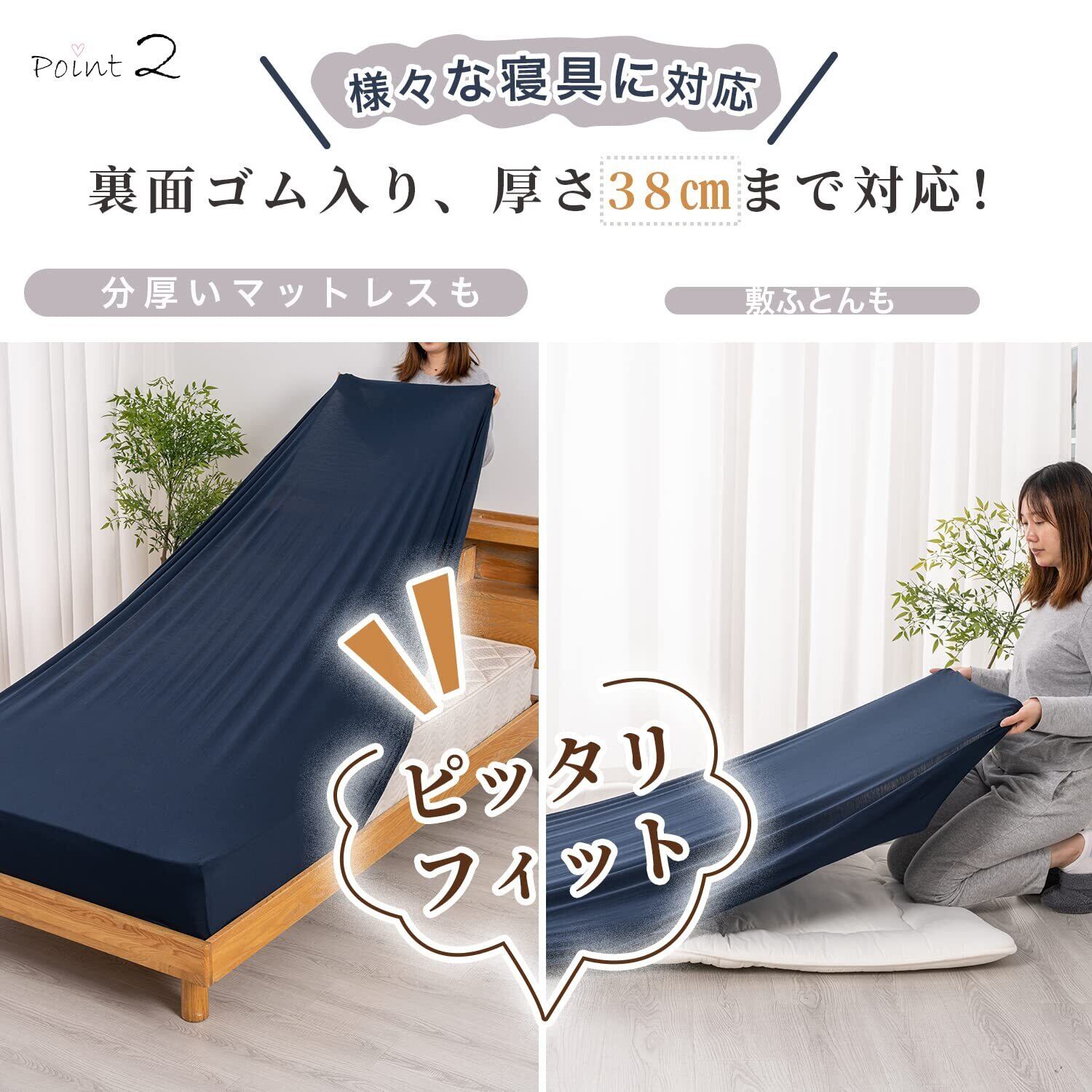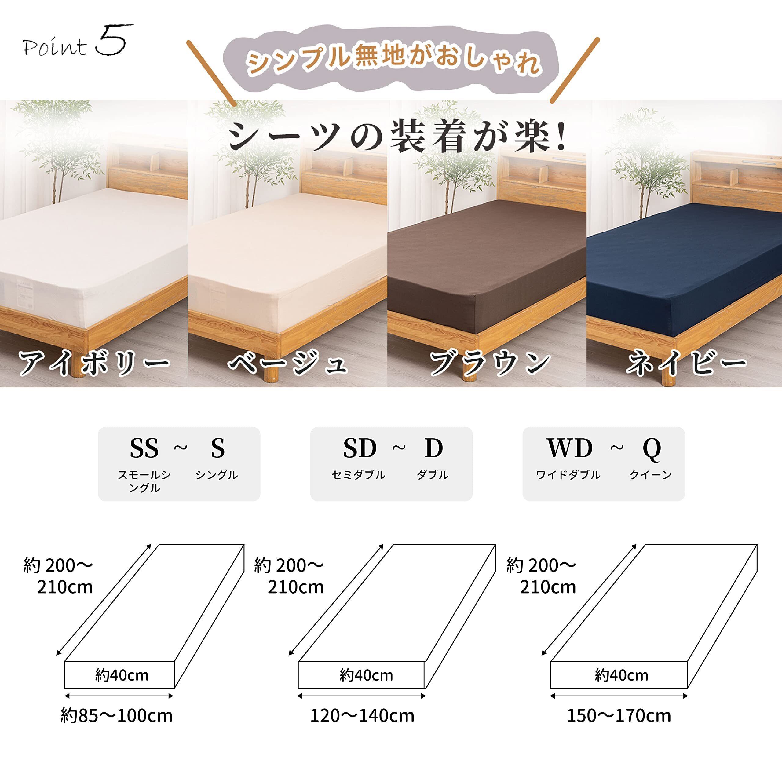 【マットレス厚さ38cmまで対応】1枚のシーツで、セミダブルとダブル(横120~140×縦200cm)の2サイズに対応。引っ越しやマットレスの買い替え時にも、このマットレスカバーをそのまま使い続けることができます。耐久性が高く、長期間使用できるベッドシーツとして、ベッド用マットレスはもちろん、敷き布団(縦210cmまで)にも対応。 裏面ゴム入りで、ぴったりフィットします。