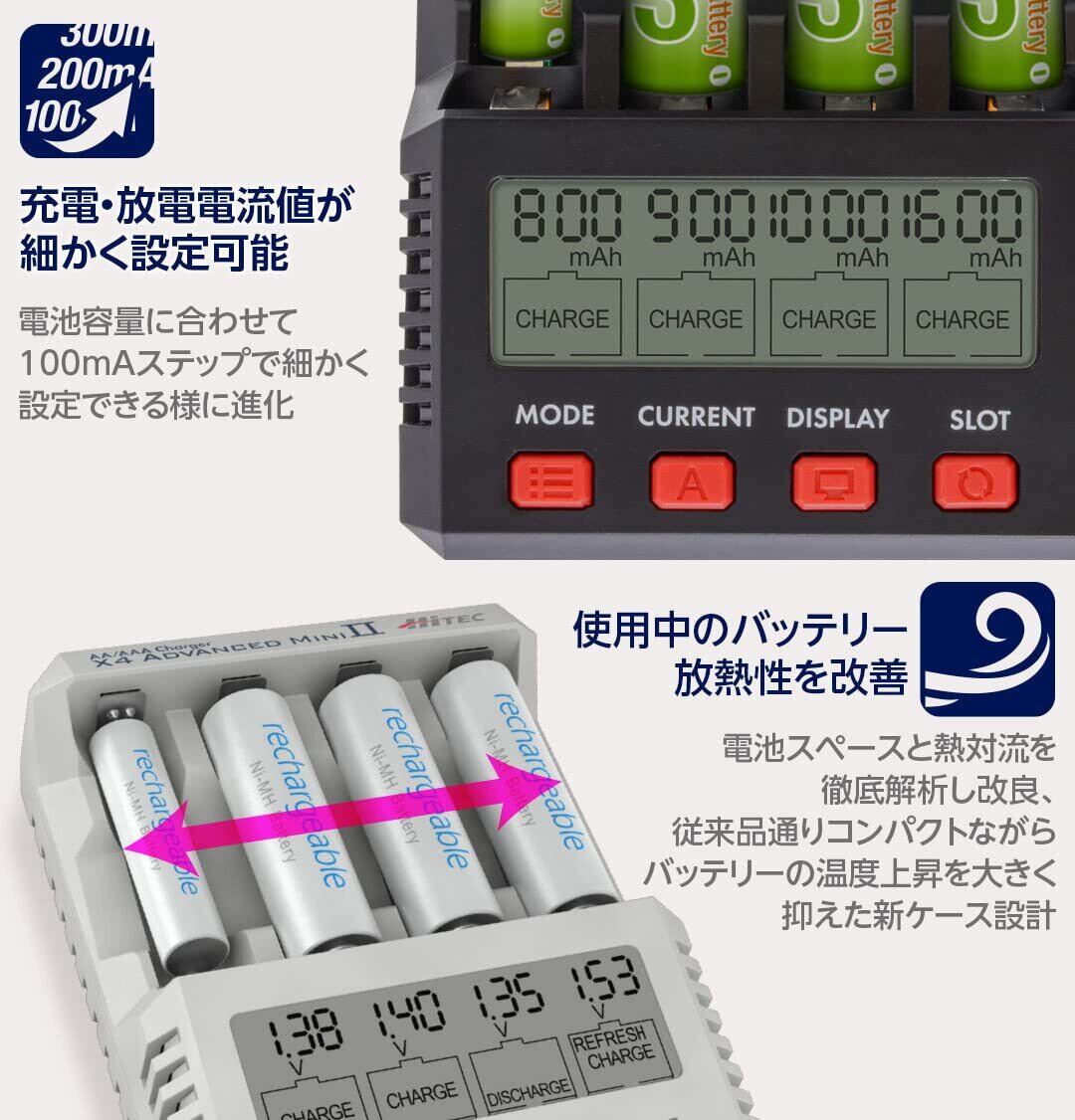 【充電・放電電流値が細かく設定可能】電池容量に合わせて100mAステップで細かく設定できる様に進化。