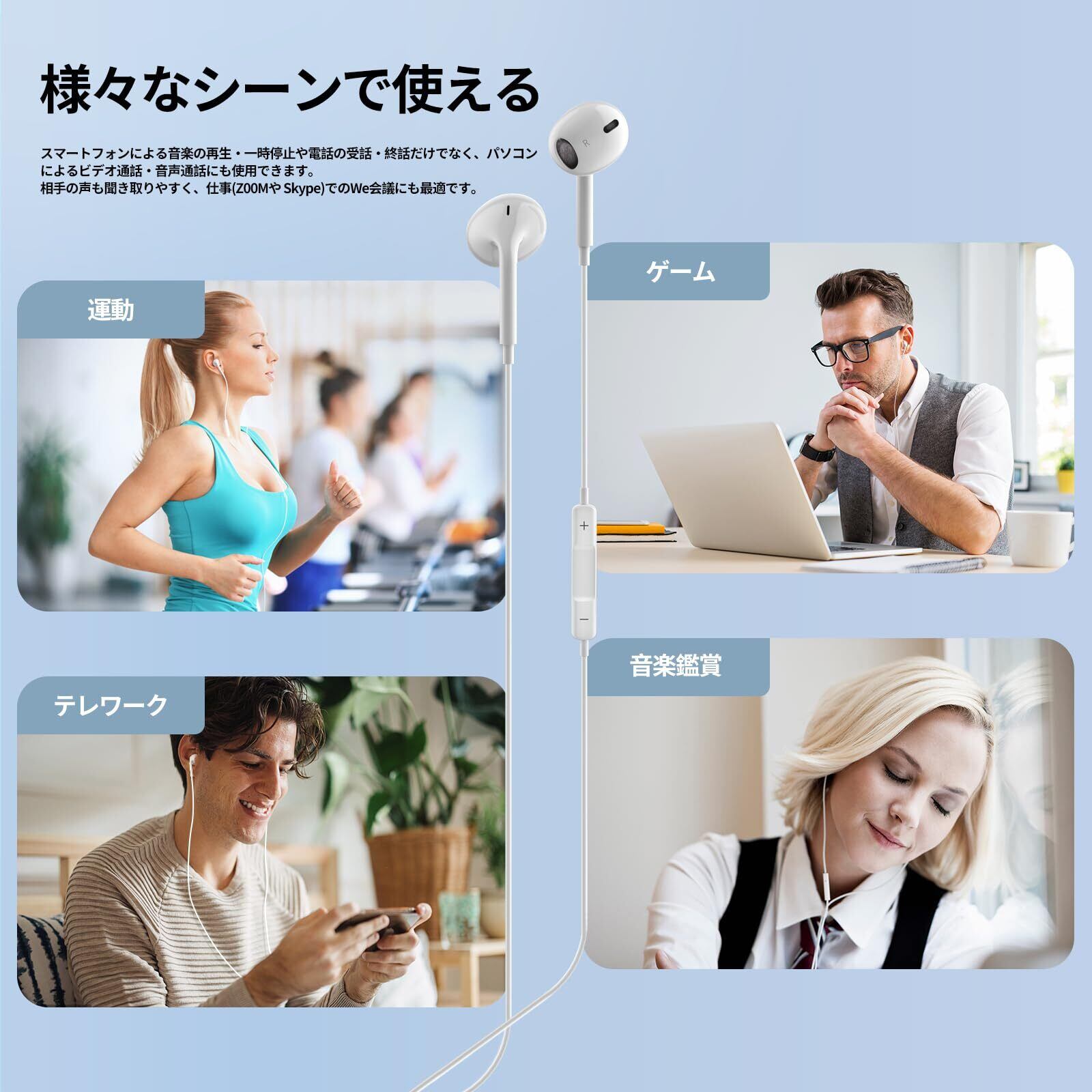 「イヤホンマイク」▶「便利」ケーブルにはリモコンとマイクを搭載。スマートフォンによる音楽の再生・一時停止や電話の受話・終話だけでなく、パソコンによるビデオ通話・ゲームにも利用できます。相手の声も聞き取りやすく、仕事(オンライン会議・テレワーク)接続してWet会議にも最適です。※ノートパソコンにはリモコンのボタンを対応しておりません。パソコン側に調整が必要になります。