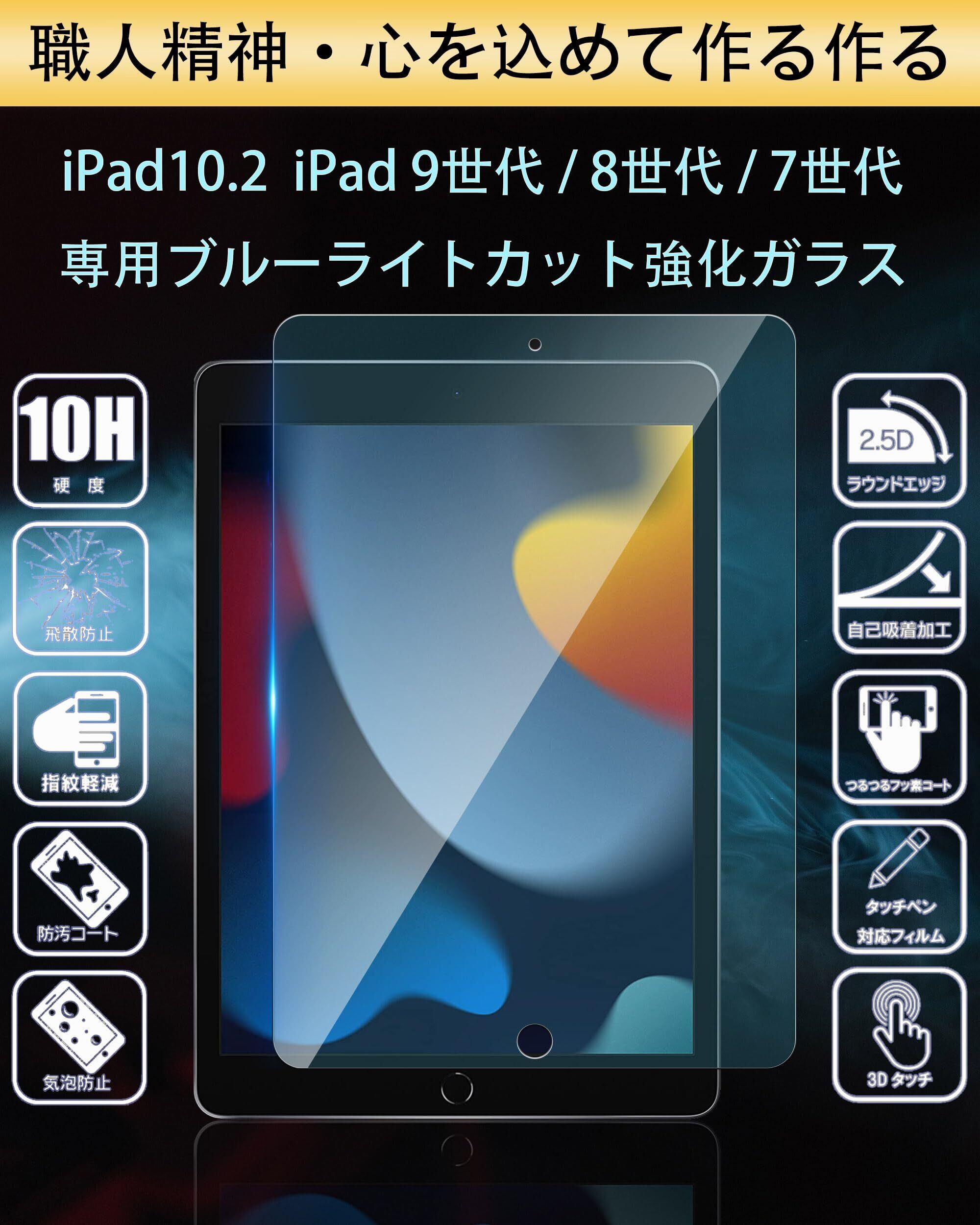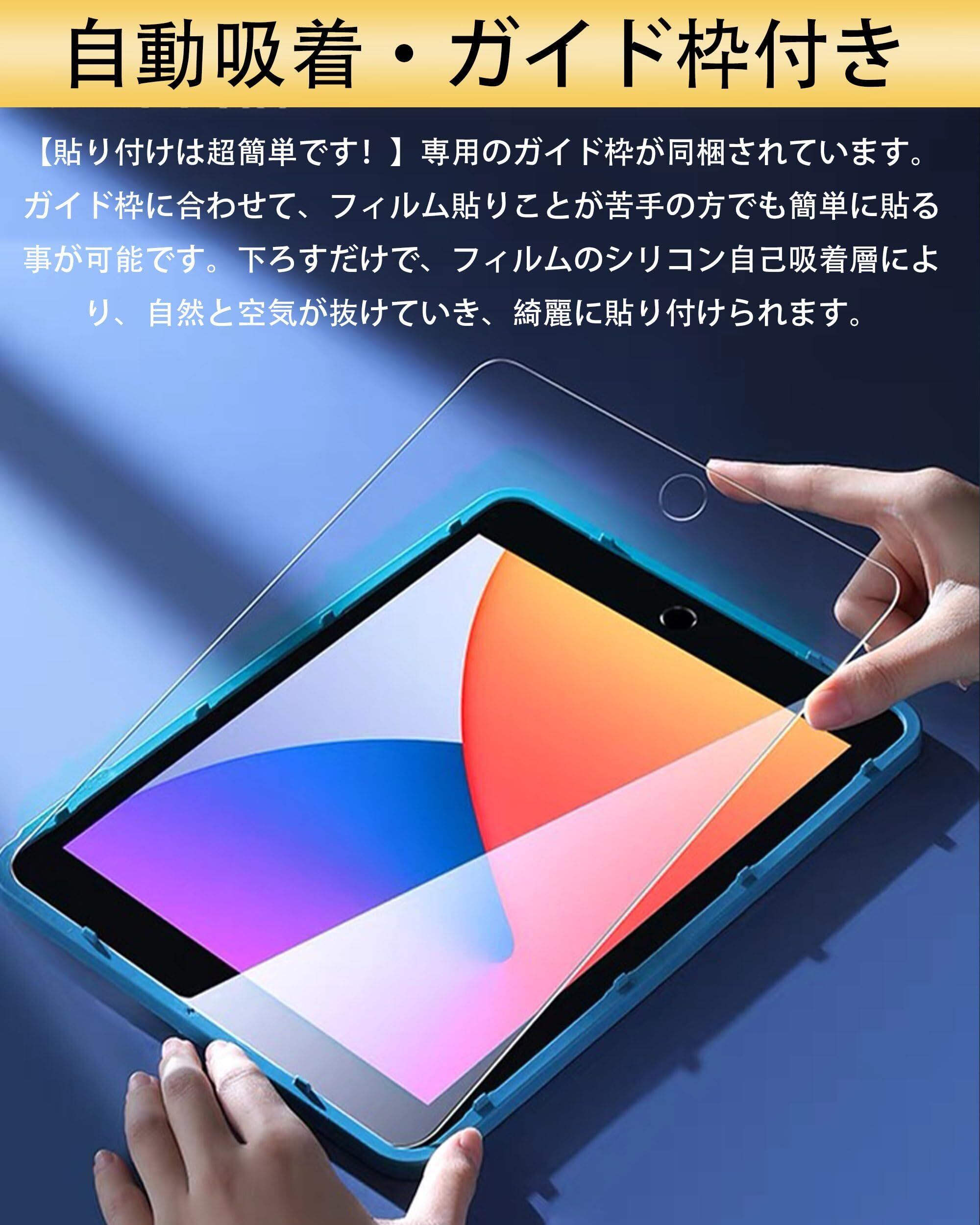 【対応機種】 iPad 9世代/8世代/7世代(2021/2020/2019年)10.2インチ 用 ガラスフィルム【 パッケージ内容】: 強化ガラスフィルム *1枚、専用ガイド枠*1枚、日本語取扱説明書、おしぼりティッシュ 、クロス、塵取りシール。貼り付けに必要なものが揃っており、即貼り付けが可能となります