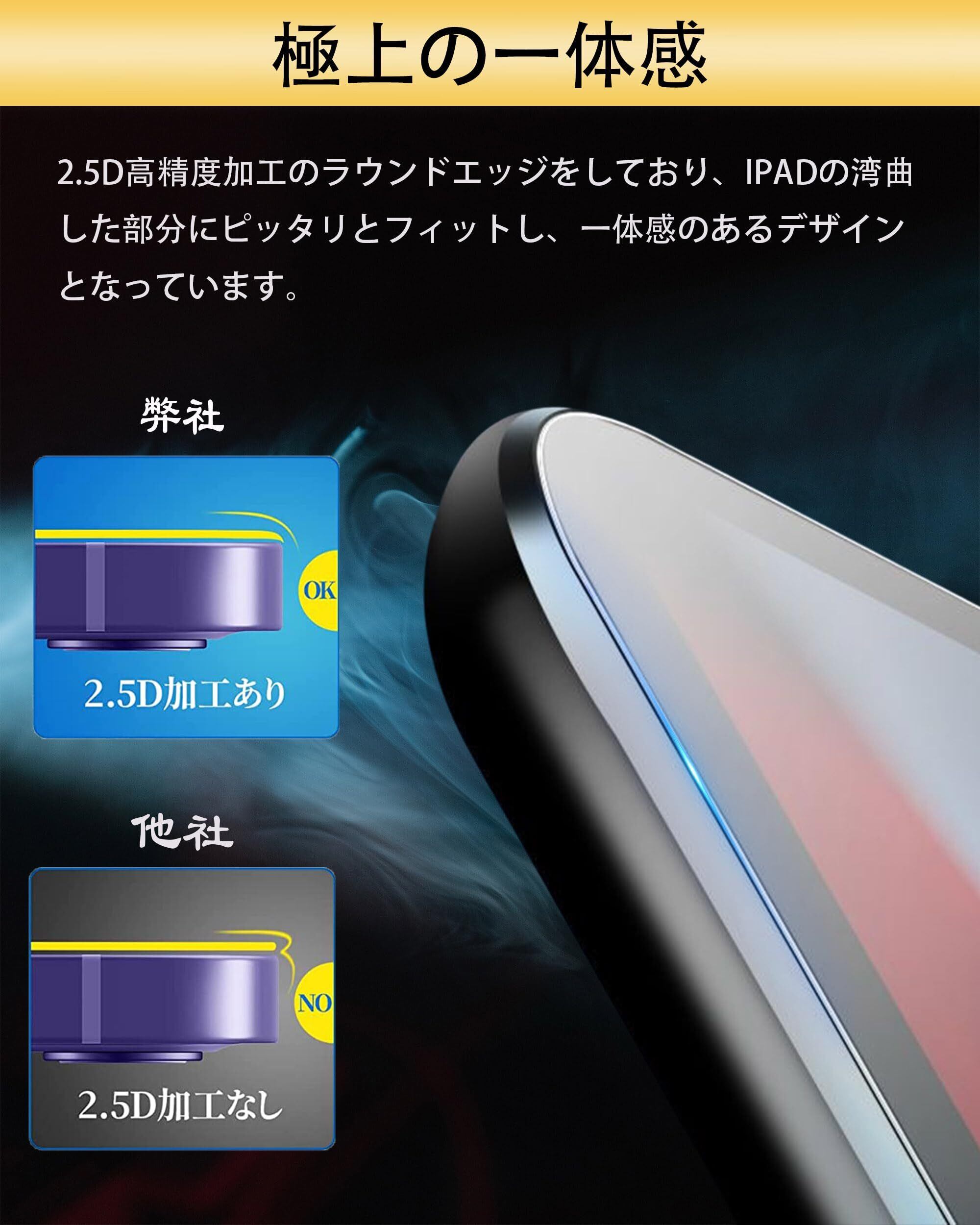 【2.5Dラウンドエッジ加工】当社は、加熱式ガラス曲げ成形技術を採用することで、ガラスフィルムのエッジを直角ではなく円弧状にしています。優れたエッジ面取り技術により、滑らかで繊細で、快適な手触りを実現することだけでなく、スマートフォンの画面と完璧にフィットすることができます。また、曲面のエッジが外部からの衝撃を分散することができ、強化ガラスフィルムの使用寿命を効果的にのばし、スマートフォンをより完璧に保護します