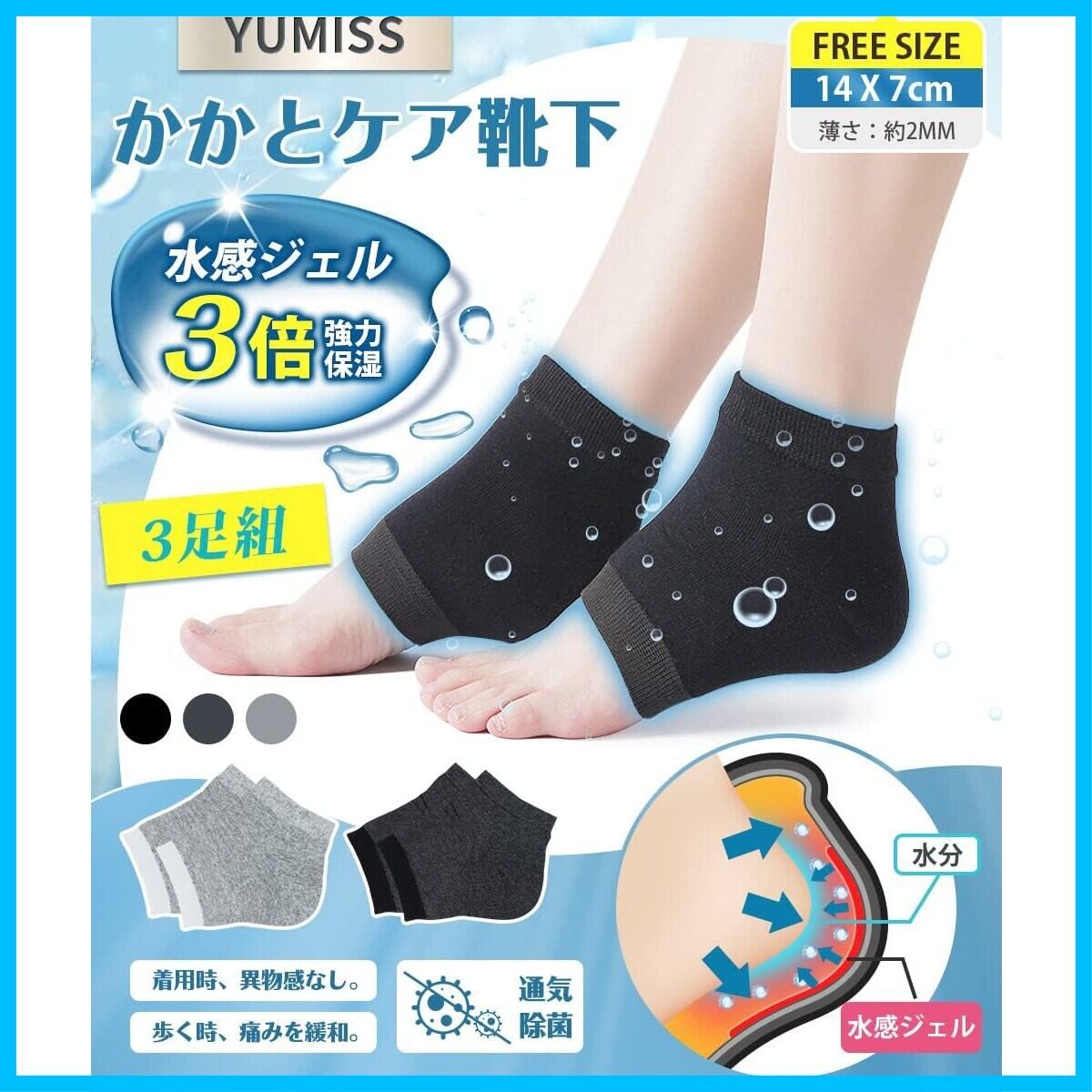 【歩く時の痛みを緩和、着用時の異物感なし】 YUMISSのかかとケア靴下はかかとの亀裂による歩くのが痛い方におすすめになります。歩行時のかかとへの衝撃を吸収し痛みを緩和することができます。シリカゲル保湿ジェルの厚さは0.8mmしかなく、生地は柔らかい。足に履いても何の負担も異物感もなし、着心地が良いです。
