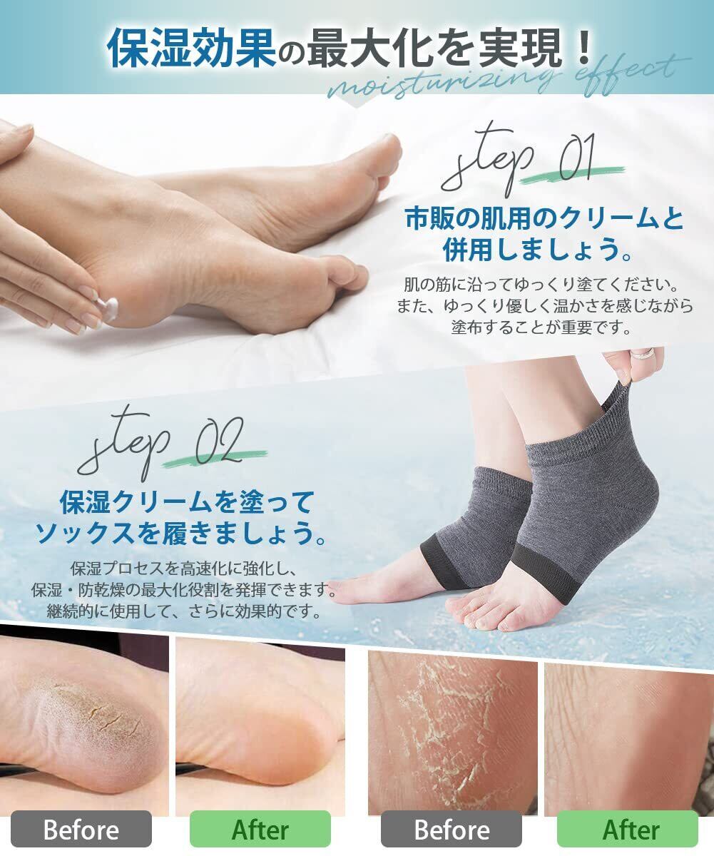 【繰り返し使用可能】 寝る時、家事をするときに優しく足のお手入れが出来ます。皮膚に潤いを与え、角質を柔らかくし、お足肌の乾燥を防ぎます。かかとを使い続けるだけでキレイになります。3足分がありますので、洗い替えできる。水洗いできます。しかもお洗濯で繰り返し使用可能!靴下によく密着していて、いくら洗濯しても落ちません。