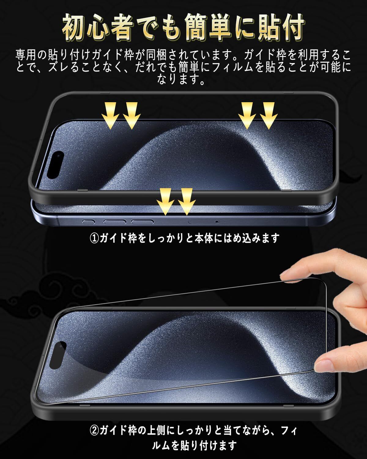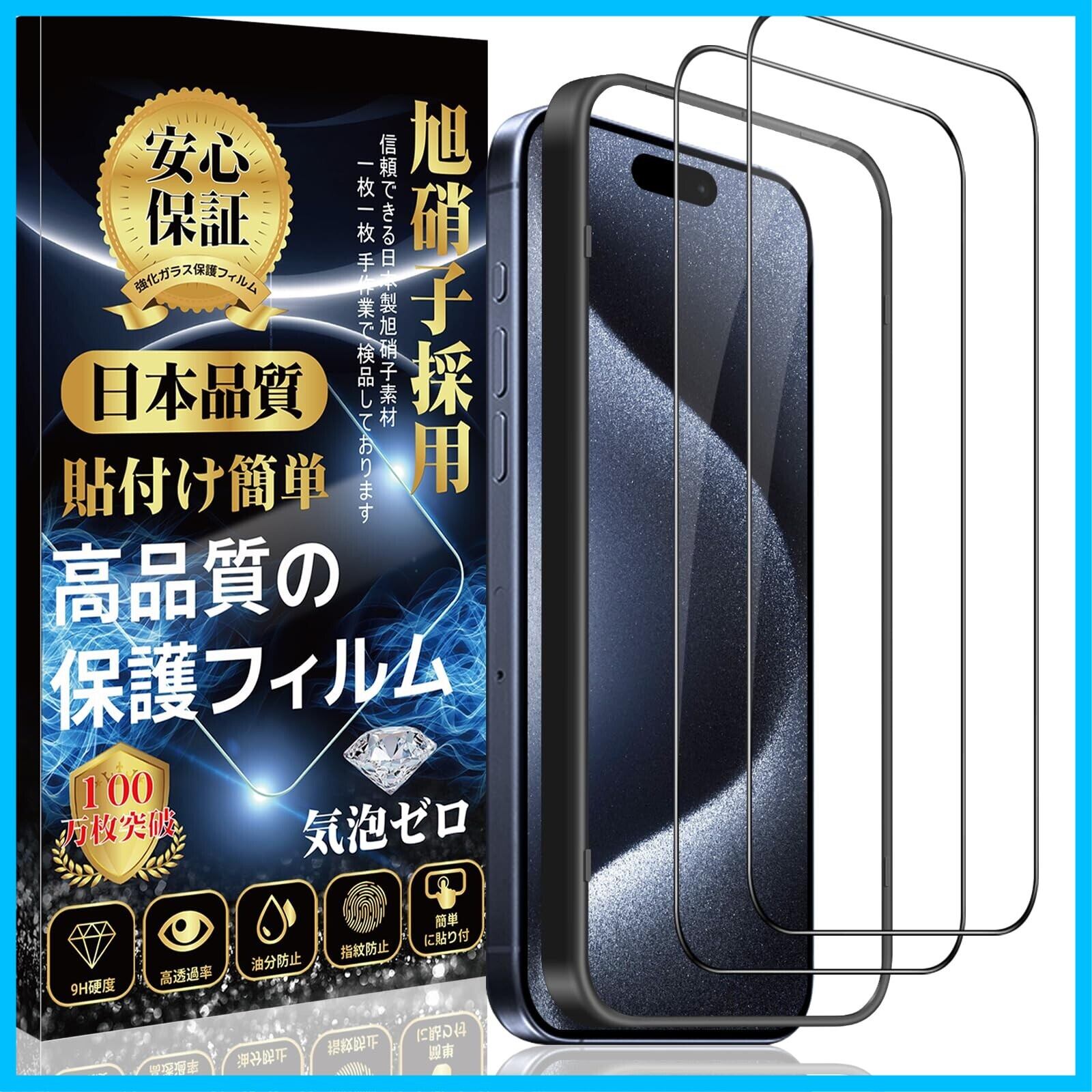 iPhone 15 Pro 対応 ガラスフィルム iPhone 15 Pro 液晶 保護 フィルム【旭硝子日本製 ガイド枠付き】硬度9H 耐衝撃 高透過率 撥水撥油 指紋防止 気泡ゼロ 貼り付け簡単 アイフォン 15Pro フィルム【2枚セット】