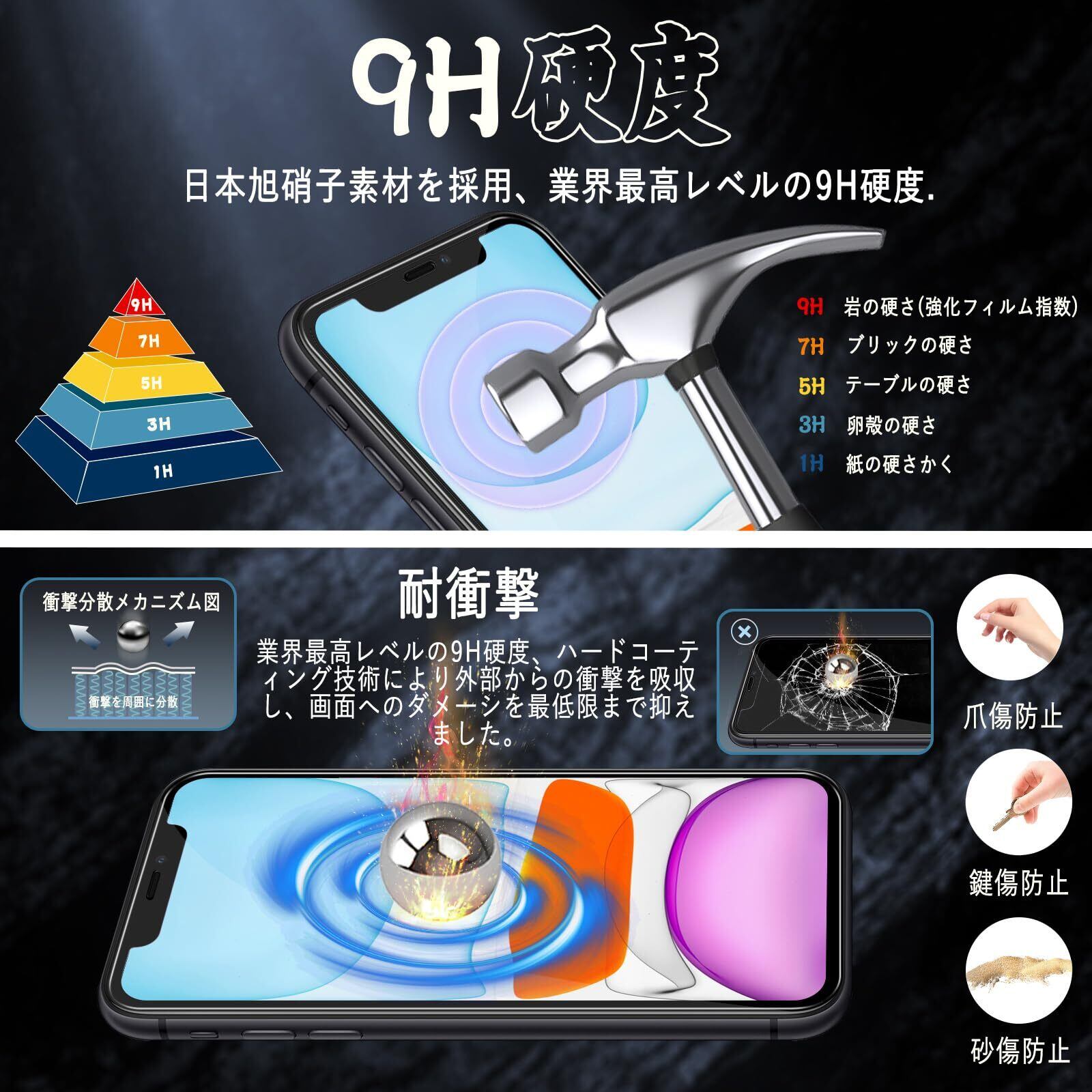 【日本製旭硝子製素材・硬度9H】表面硬度9Hと非常に高い硬度の持つ素材を採用し、外部の衝撃を吸収し、画面への損傷を最小限に抑えることができます。日々の生活の中で発生しうるスリ傷から液晶画面を保護します、耐久性がありながら損傷しにくいです。